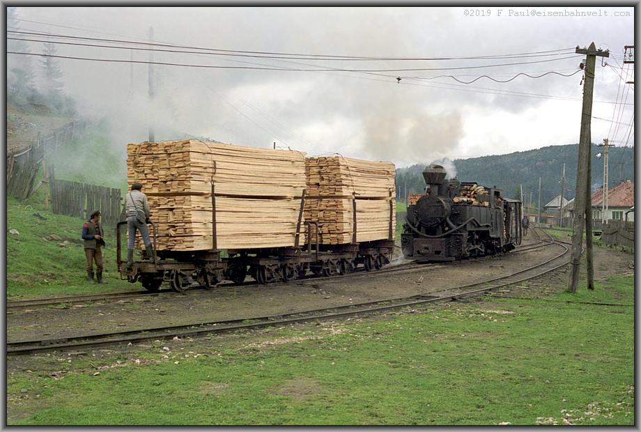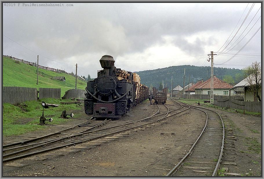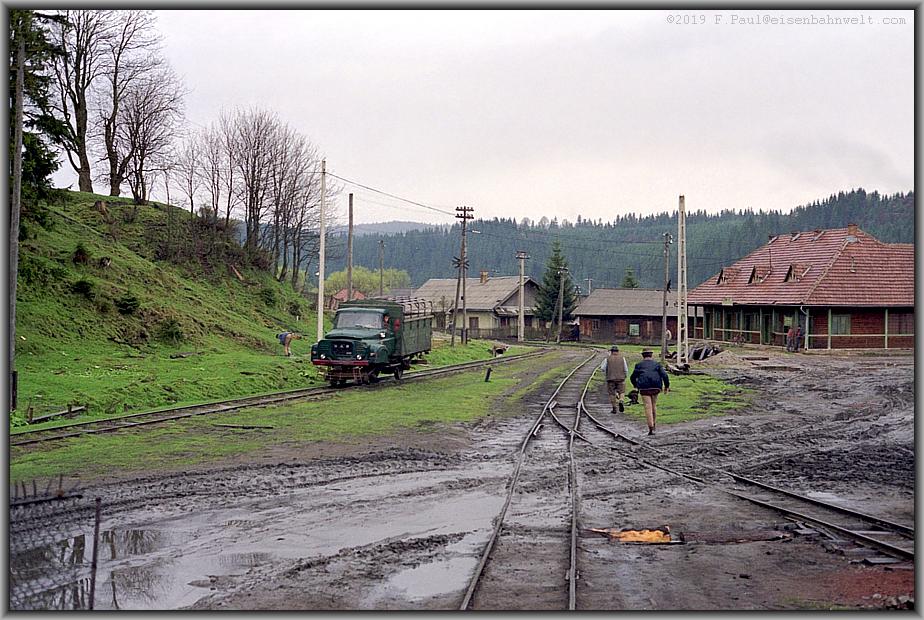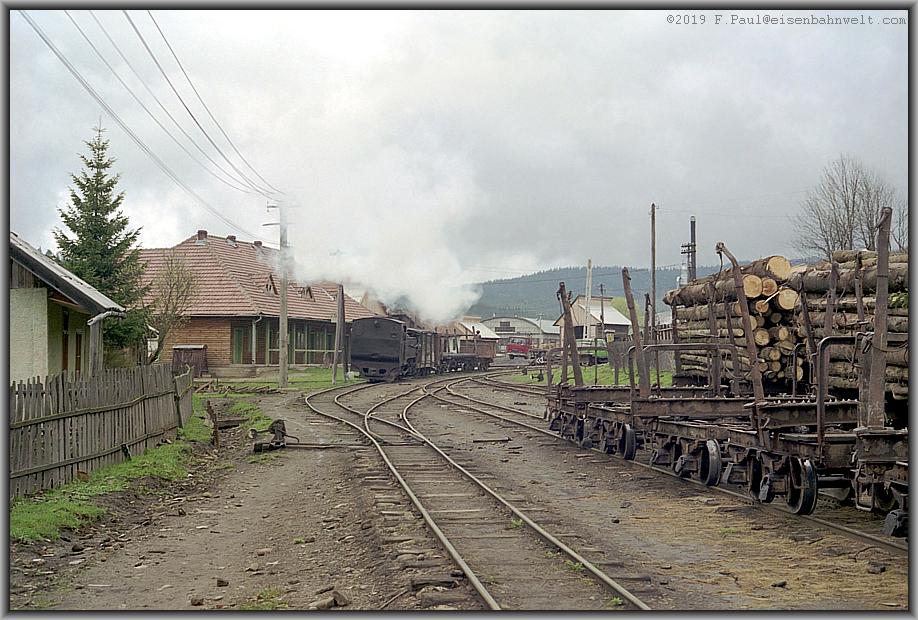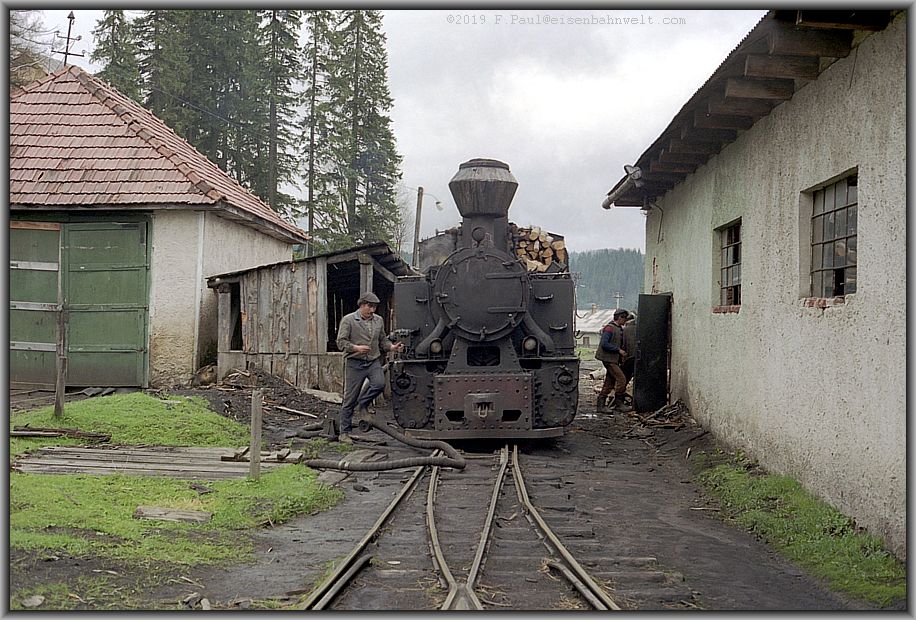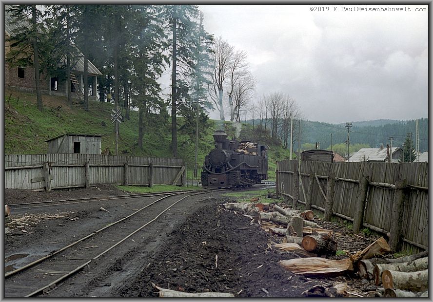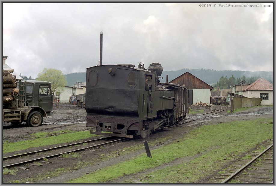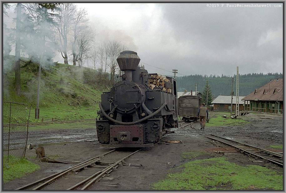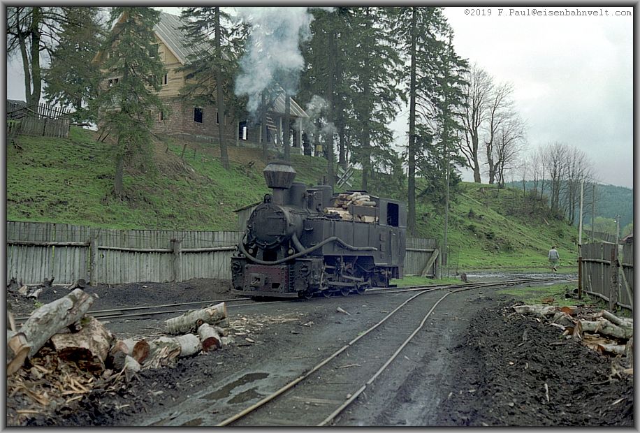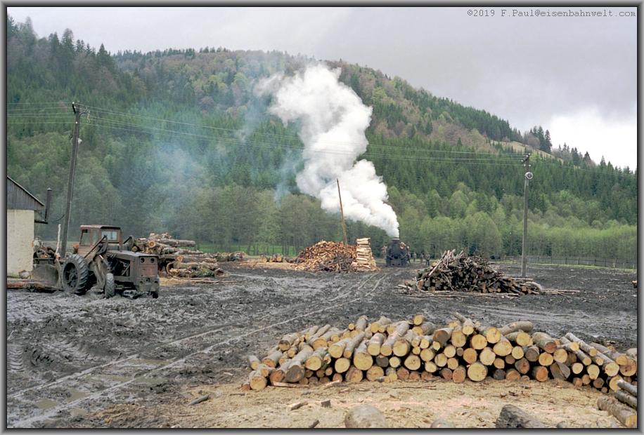 für uns, wir warten auf den von der ersten Fahrt aus Siclau zurückkehrenden Dampfzug. Und da schwankt sie auch schon auf dem ausgeleierten Streckengleis entlang des schlammigen Fahrweges heran,