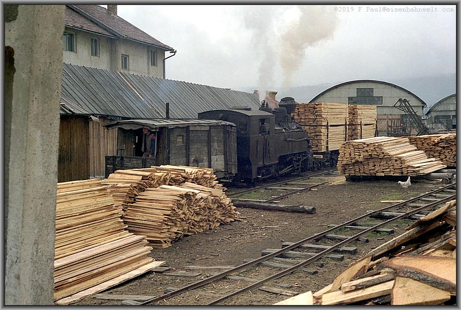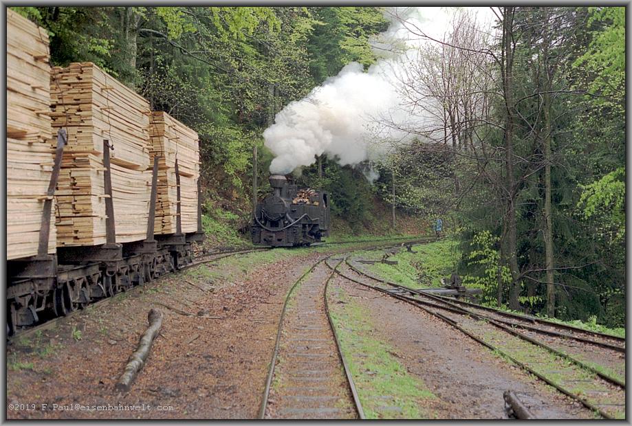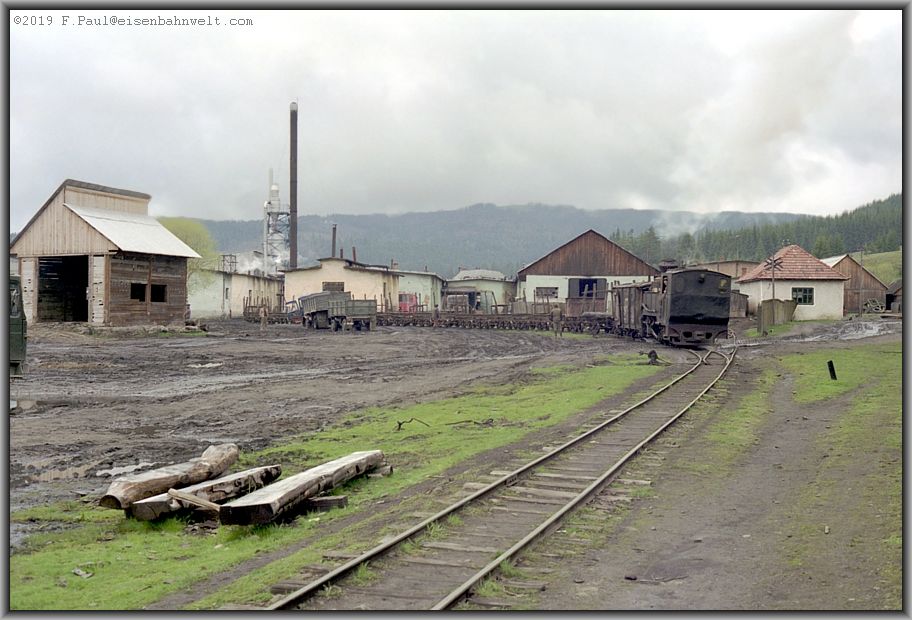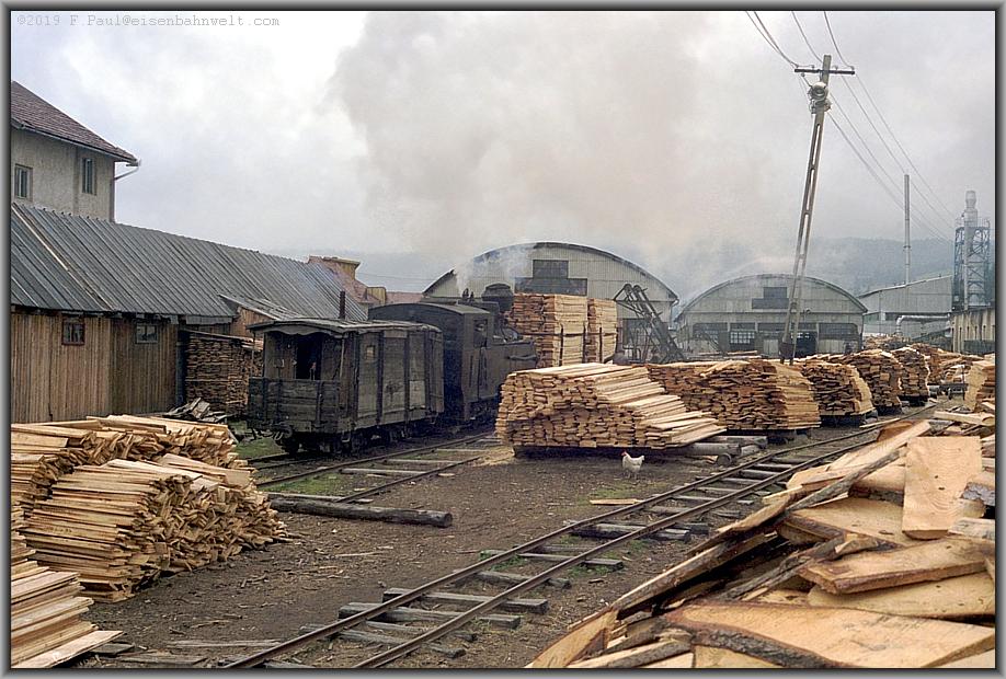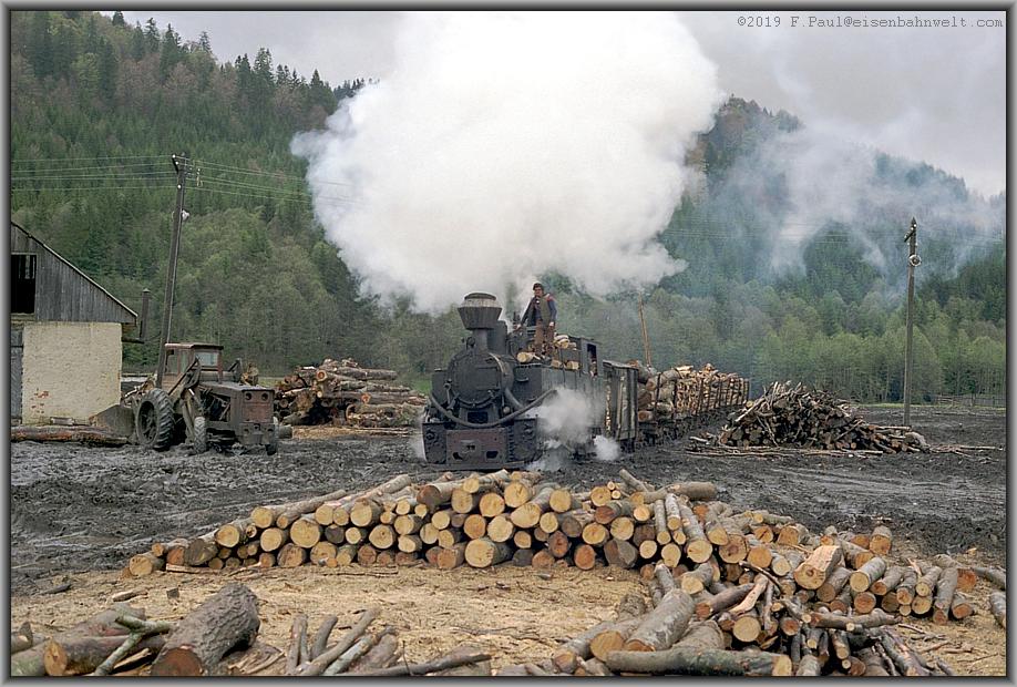 in Richtung Sägewerk, um den dort schon auf Beladung wartenden Arbeitsvorrat noch ein bißchen zu ergänzen. Abkuppeln, fertig zum Zurückkehren in den Bahnhof, während ein LKW neue Stämme aus dem Einzugsgebiet