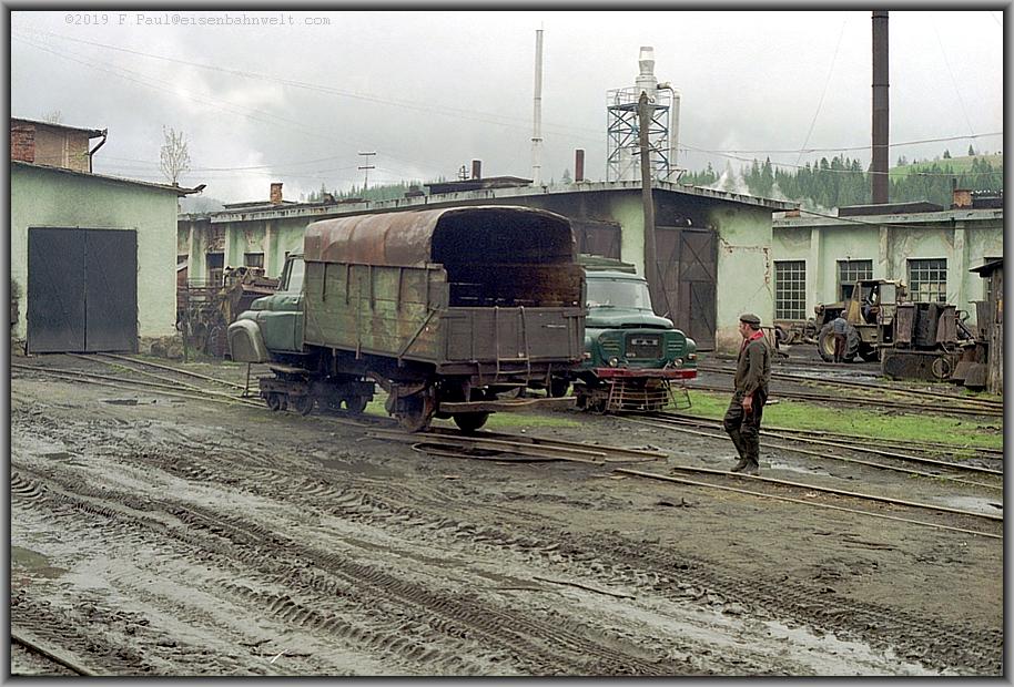 Aber bald schon tut sich wieder etwas auf dem Gelände! Zuerst trifft ein Schienen-LKW aus Richtung Holumpass ein und verfügt sich zum Draisinenschuppen hin. Und wenig später