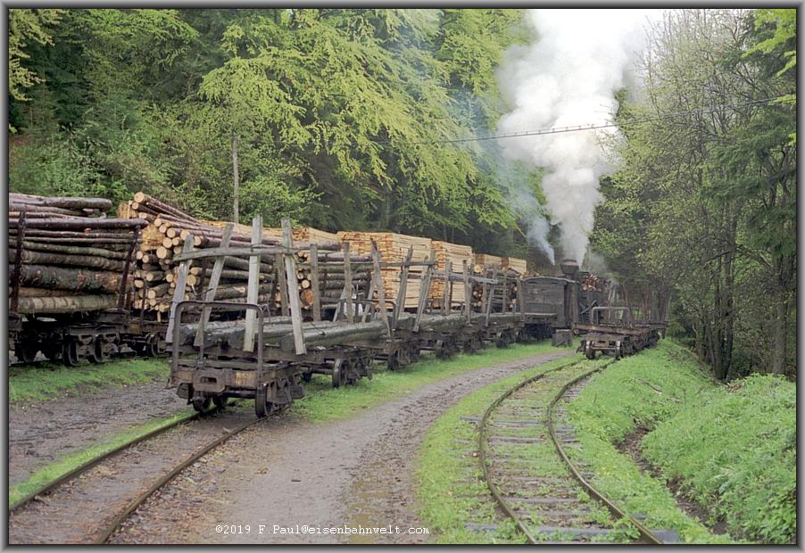 mit 10 Wagen entsteht. Scheppernd und klirrend entfernt sich das Züglein mit voschriftsmäßig besetzter Schlußbremse in Richtung des Bahnhofs der Waldbahn.