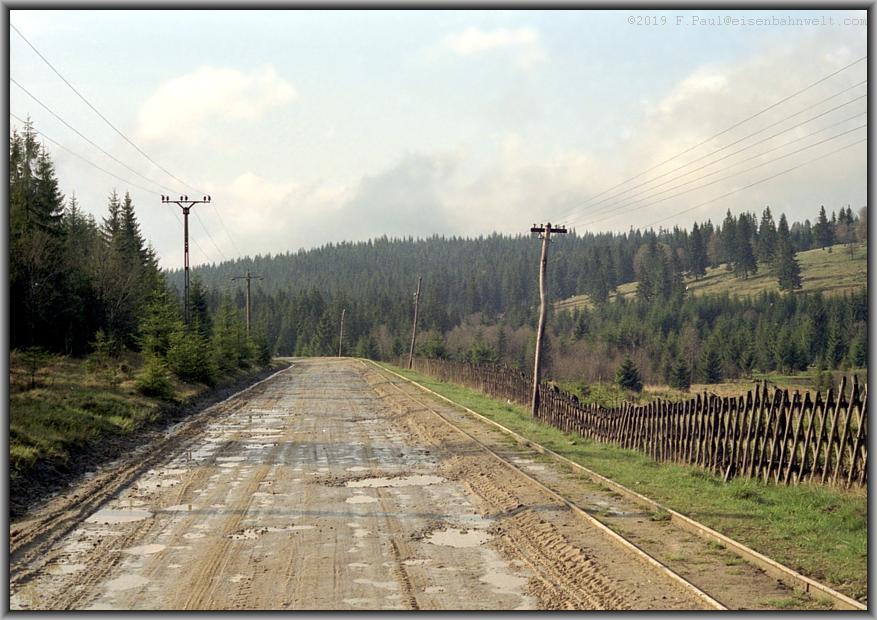 Die Große Bosca ist überquert und die unbefestigte Straße nach Covasna erreicht. Das bis zum Neubau der Boscabrücke benutzte Streckengleis dient nun als Anschlußverbindung