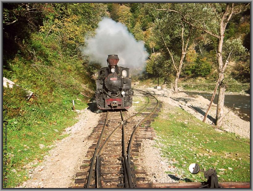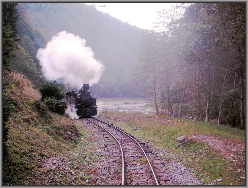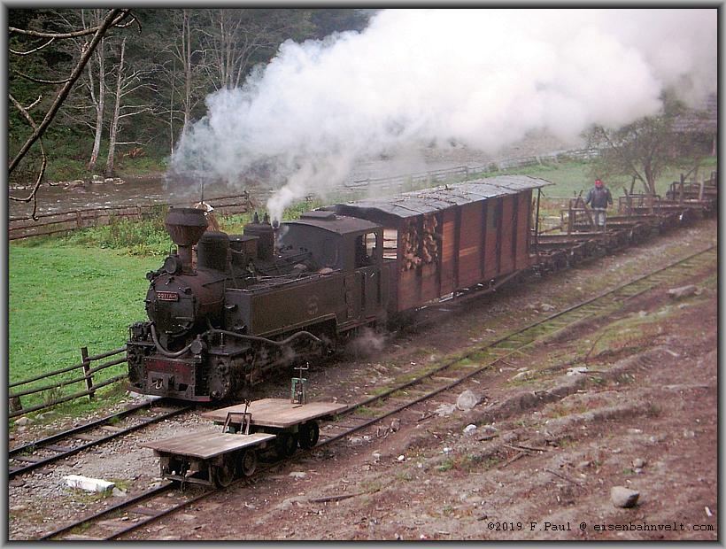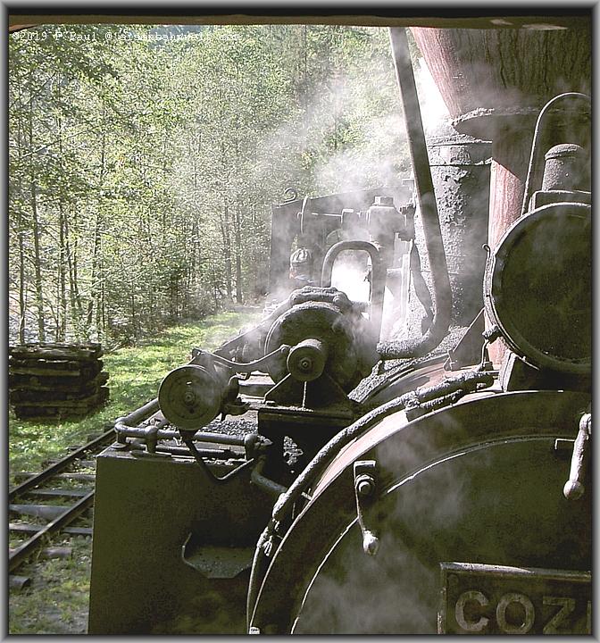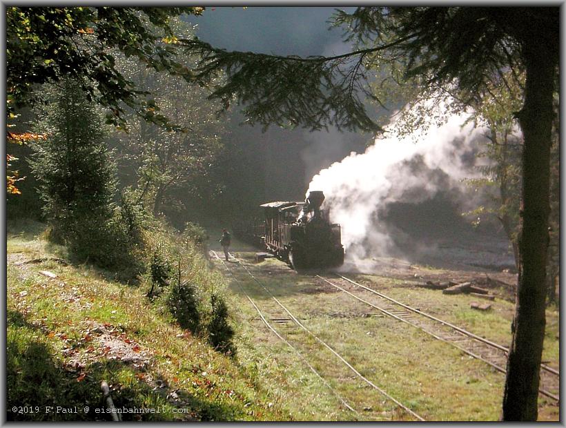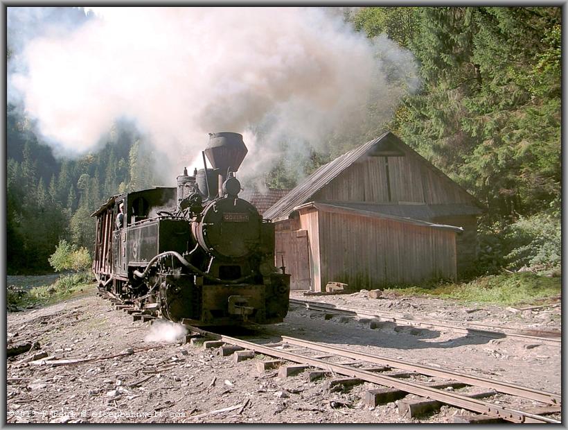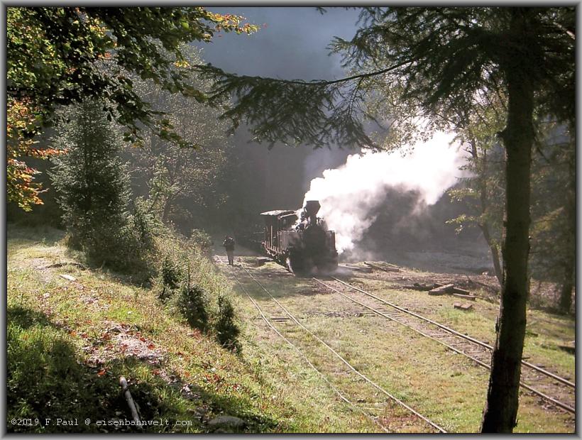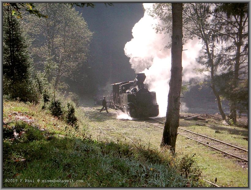 Und es wird noch romantischer bei der Pause in Glimboca! Friedlich schmaucht die kleine Lok vor sich hin, senkrecht steigt der Abdampf in die Luft, von keinem Windhauch umgelenkt oder zerrieben!