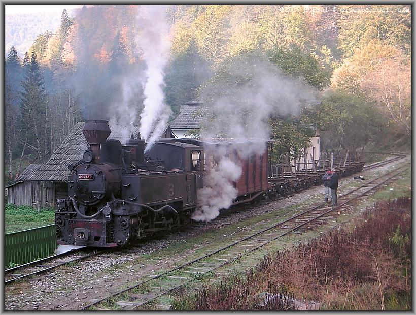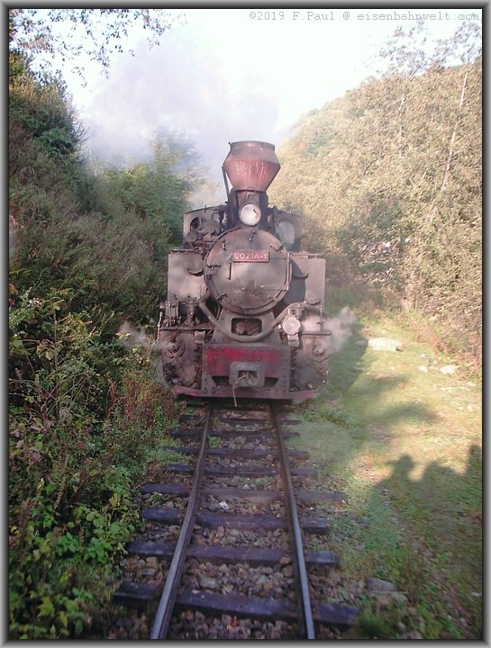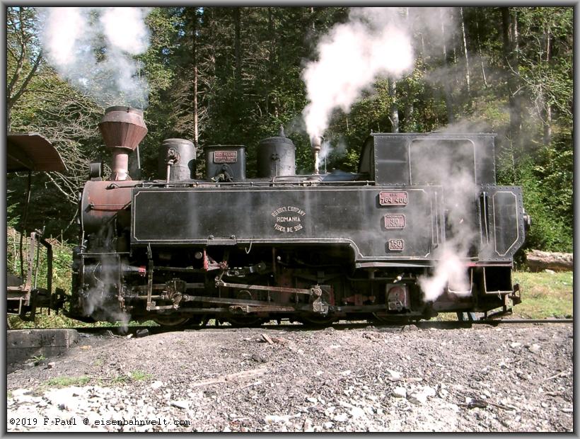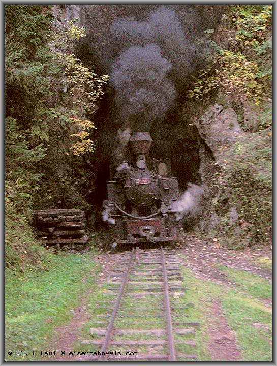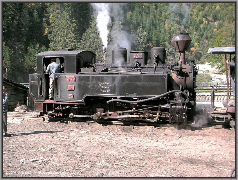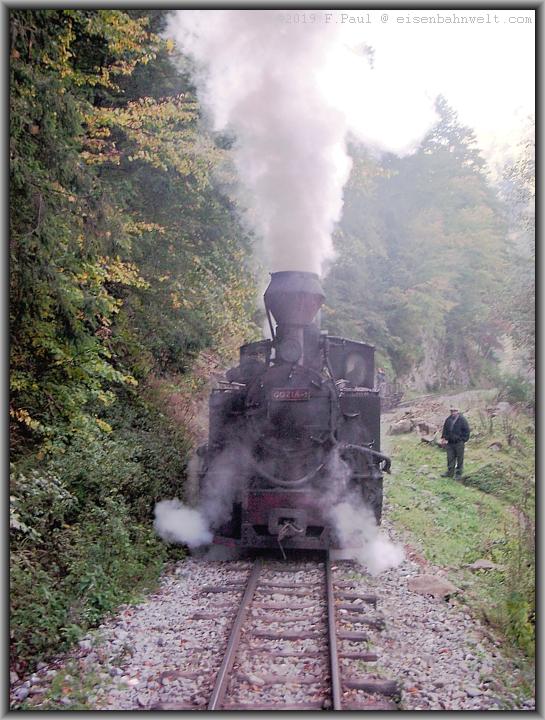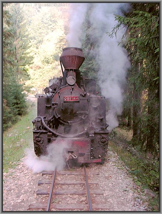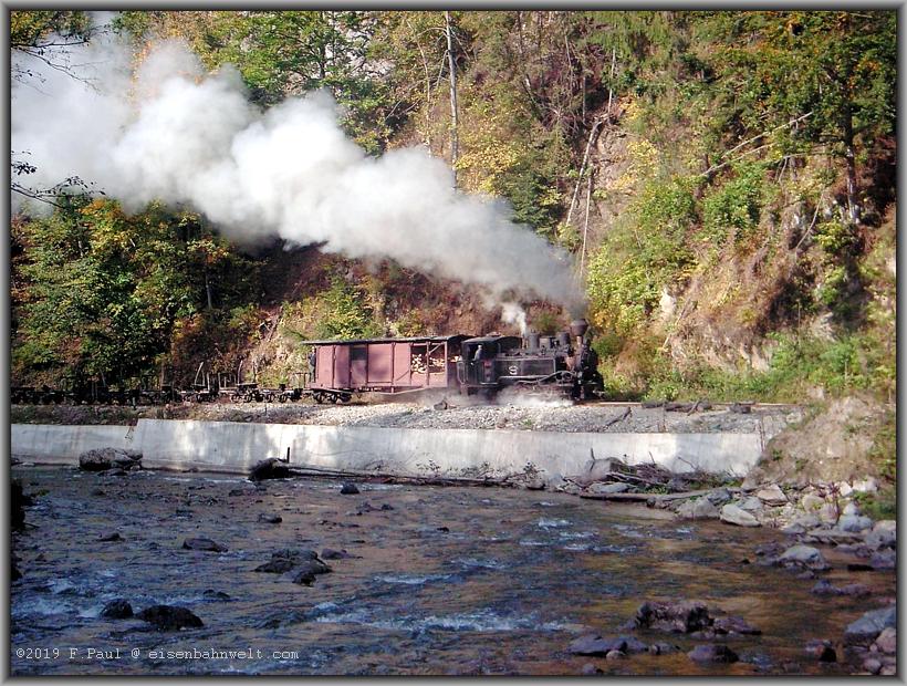 Und es wird noch romantischer bei der Pause in Glimboca! Friedlich schmaucht die kleine Lok vor sich hin, senkrecht steigt der Abdampf in die Luft, von keinem Windhauch umgelenkt oder zerrieben!