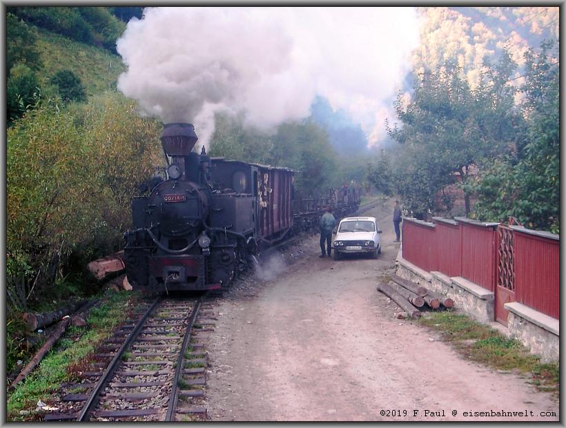 Das Gleis verläuft hier neben dem Fahrweg und hier fahren auch noch 15 Jahre nach dem Sturz des Sozialismus noch PKW der Marke Dacia.