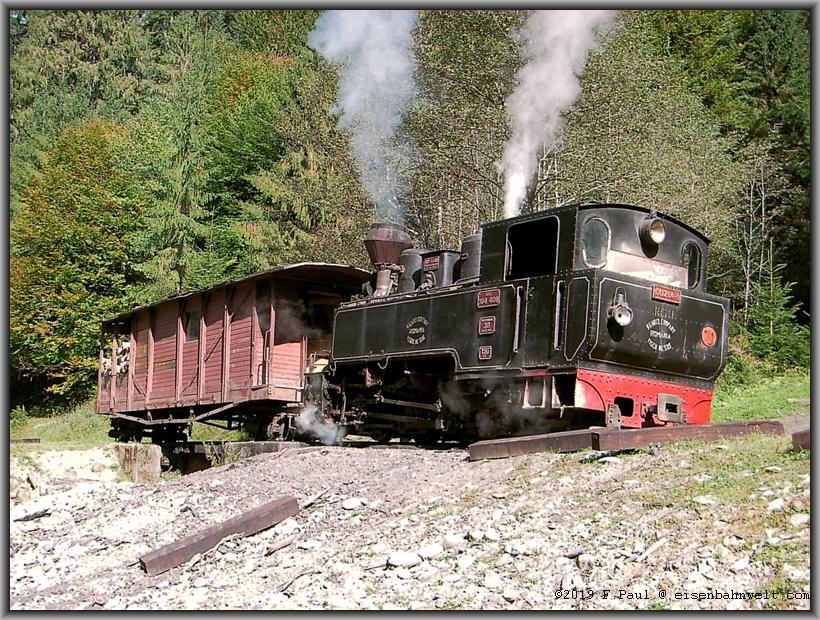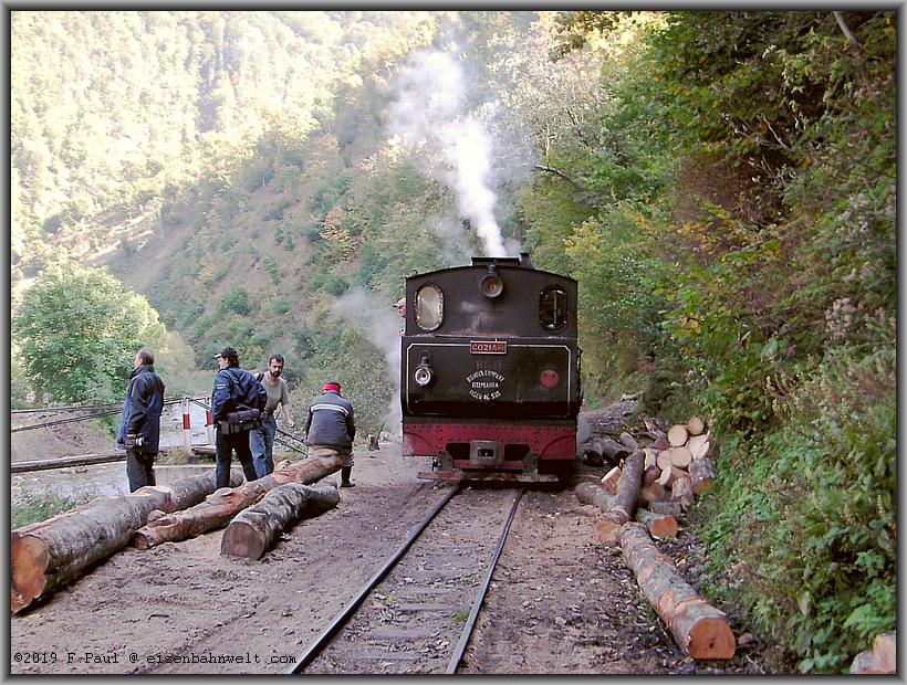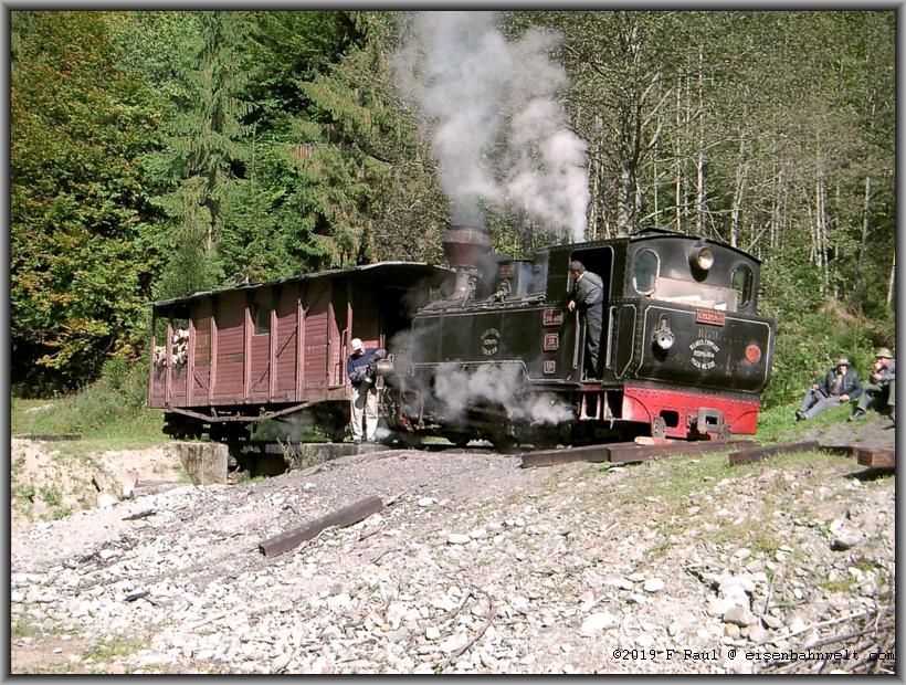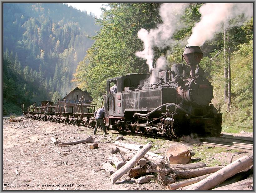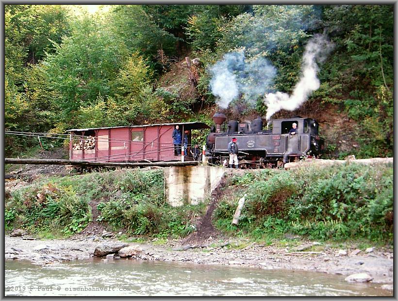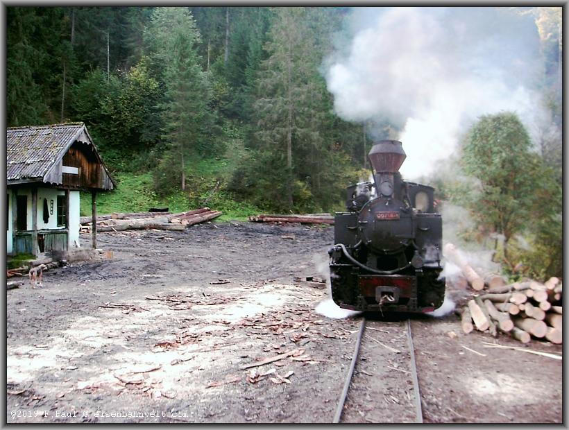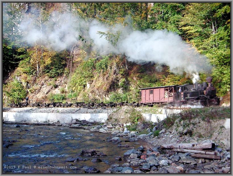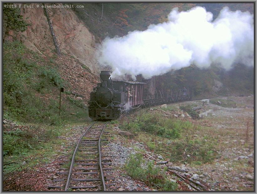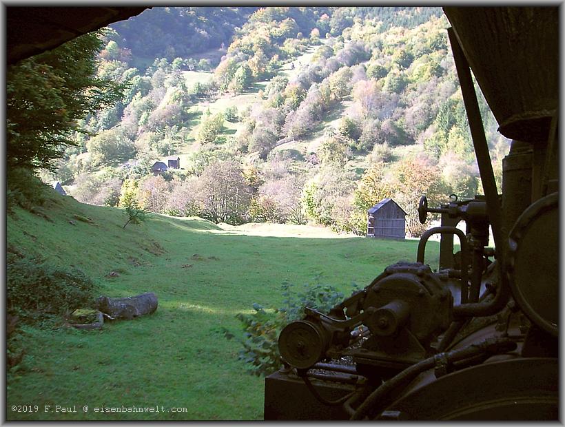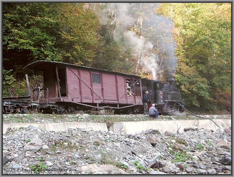 und ein wenig später die mitgeführten Holztrucks talaufwärts abholbereit zu positionieren. Rückkehr auf die Talseite, Ankuppeln an den dort wartenden Dienstwagen, und schon steht der Zug