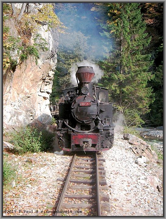 Aber es geht weiter, erst einmal auf der dunklen Seite des immer enger werdenden Tals schraubt sich das Bähnle immer höher den Berg hinauf, um ein paar hundert Meter