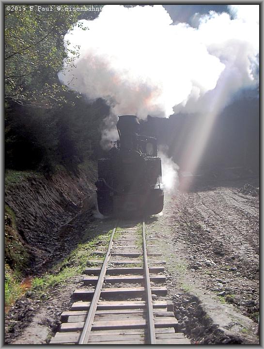 zur Rückfahrt bereit. Nein, noch nicht, dem Schienen-LKW wird der Vortritt gelassen! Brummend und scheppernd eilt er von dannen. Nun heißt es, auf der Bühne hinter der Lok Platz zu nehmen, um die dampfgetriebene