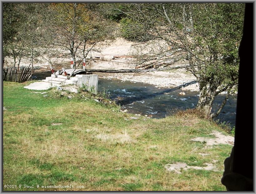 den wartenden Zug von der anderen Flußseite zu betrachten. Welchem Zweck wohl die hier "heruntergefallenen" Baumstämme dienen? Nun, ihre vorgesehene Verarbeitung im Sägewerk dürften sie wohl nicht mehr