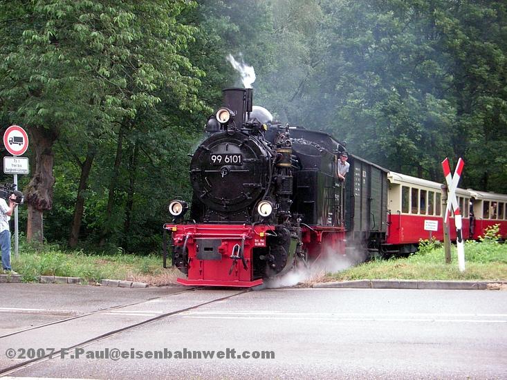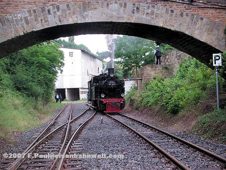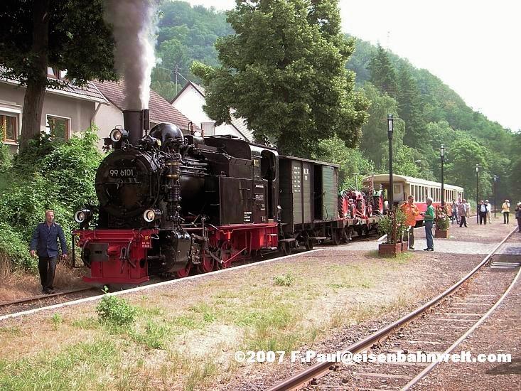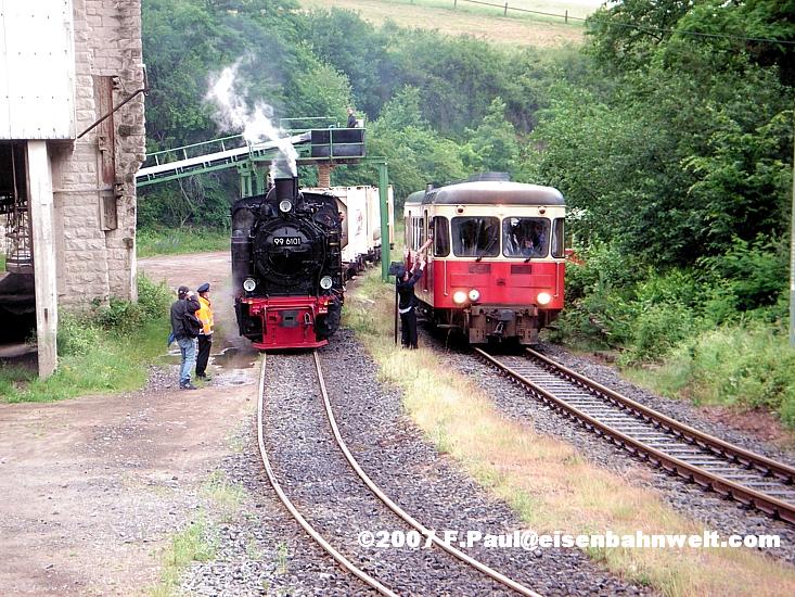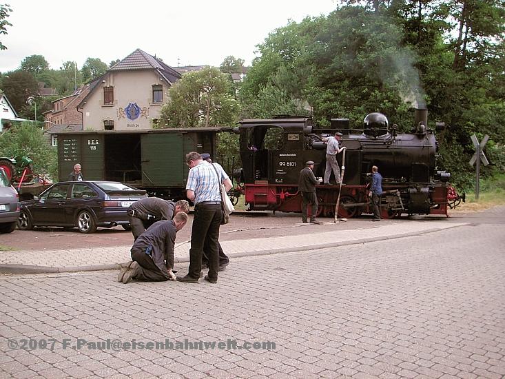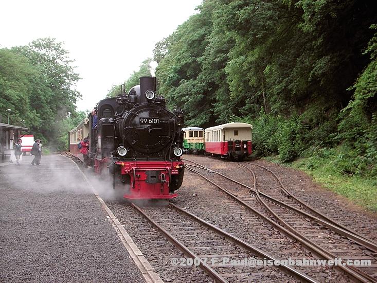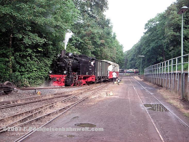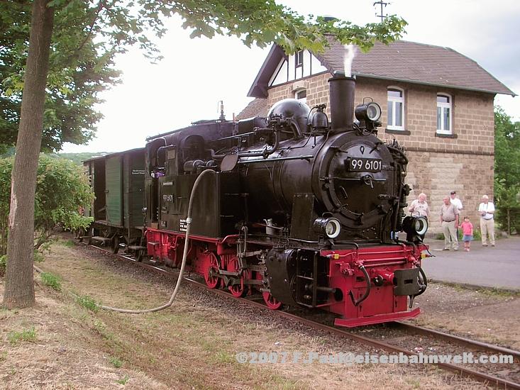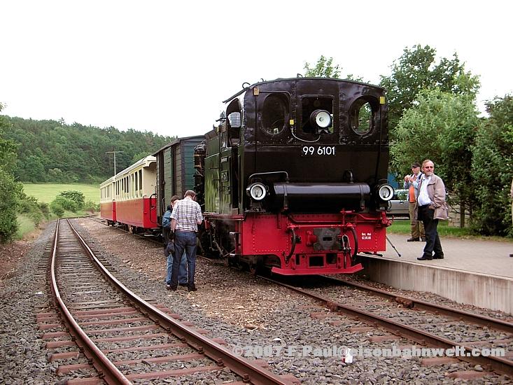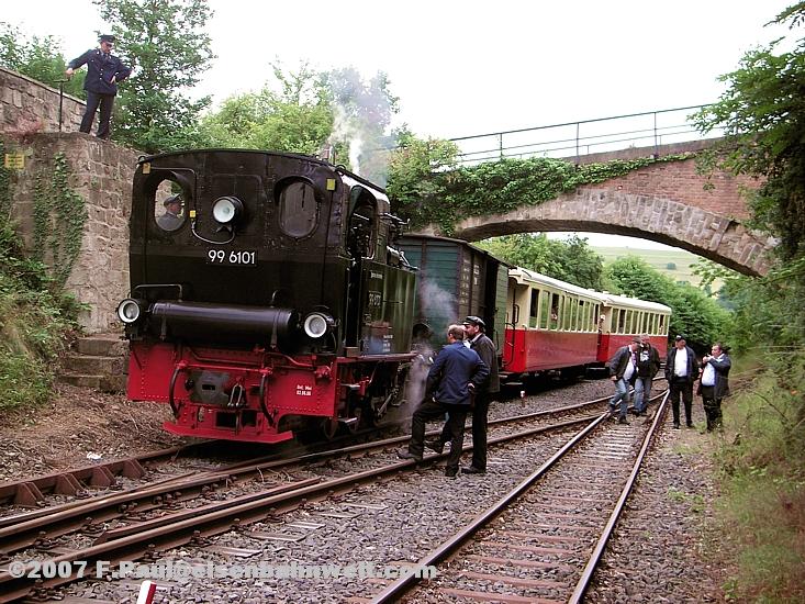 ist 99 6101 wieder im Bahnhof eingetroffen und stellt den Sonderzug zusammen: Packwagen, 2 Personenwagen, die beiden Phonolith-Wagen sowie