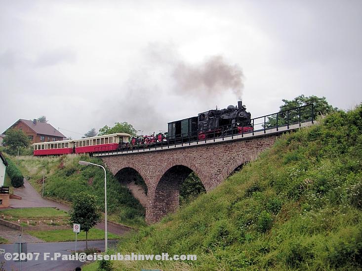 einem baumbestandenen Steilhang, auf der rechten Seite gibt es endlich Wasser für die durstige Lok. In Niederzissen wurde das
