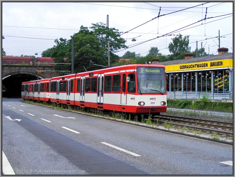 Aber Linie 3 der Kölner Verkehrsbetriebe (KVB) kreuzt die Bahntrasse. Zwei Stadtbahnwagen B passieren gerade den Brückentunnel auf ihrer Fahrt Richtung Hohlweide.