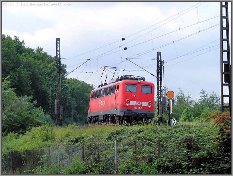 In einer Linkskurve mündet die Strecke nach Gremberg Nord hinein. 140 374 ist auf dem Ortsgleis vor dem Einfahrsignal zum Halten gekommen. Sie will dort FIR 51239