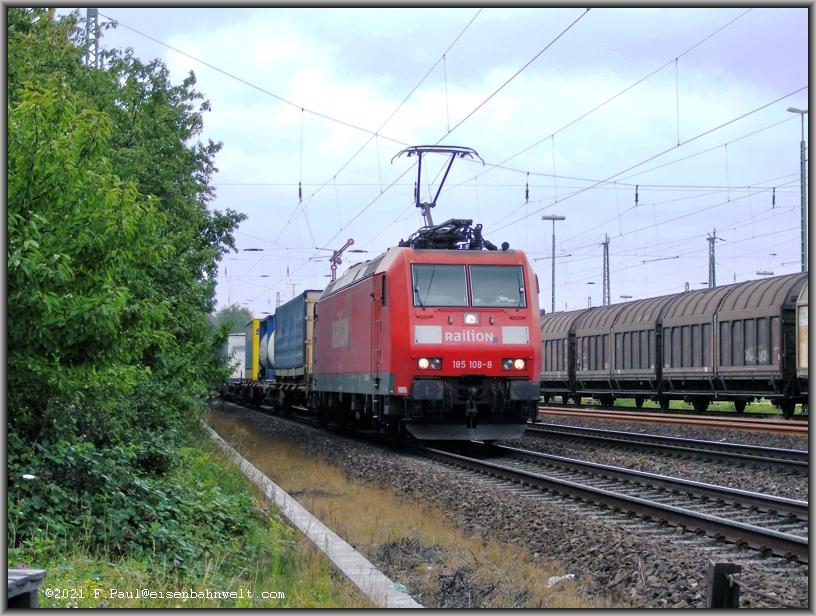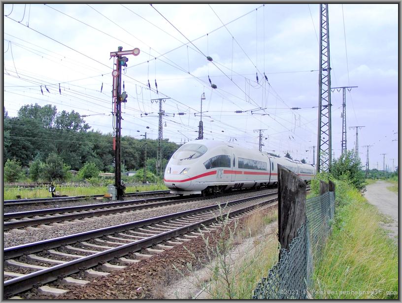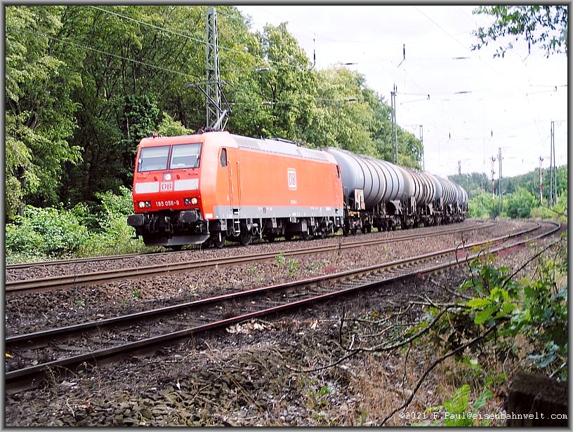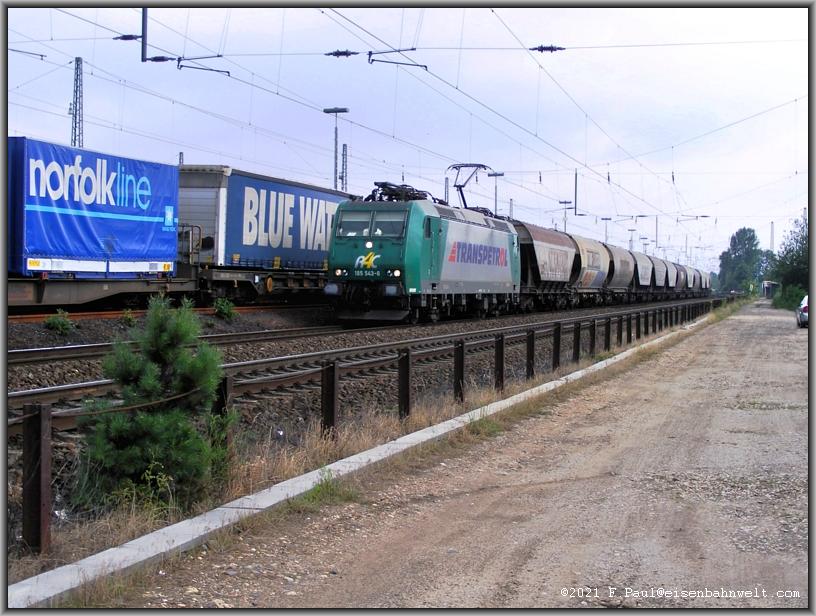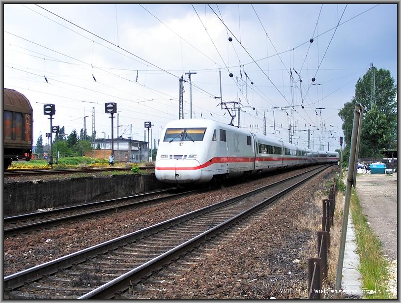 und Stahlseil getrennt. Und schon rollt R4C-185 543 mit DGS 91160 (Bottrop-Hegyeshalom) durch den Bahnhof. Im Abstand schleicht 402 016 als ICE 644 an den Gleissperrsignalen