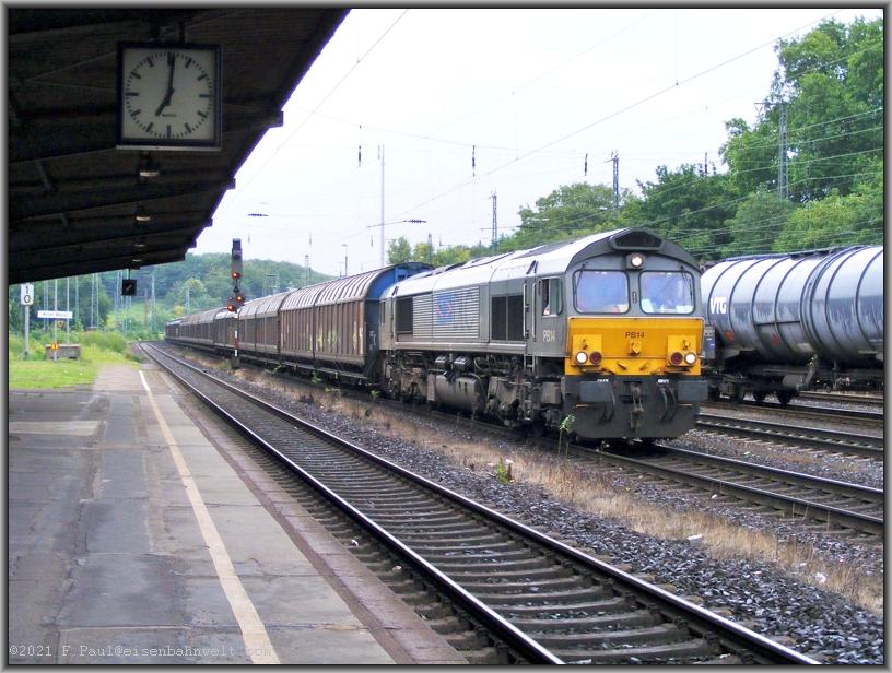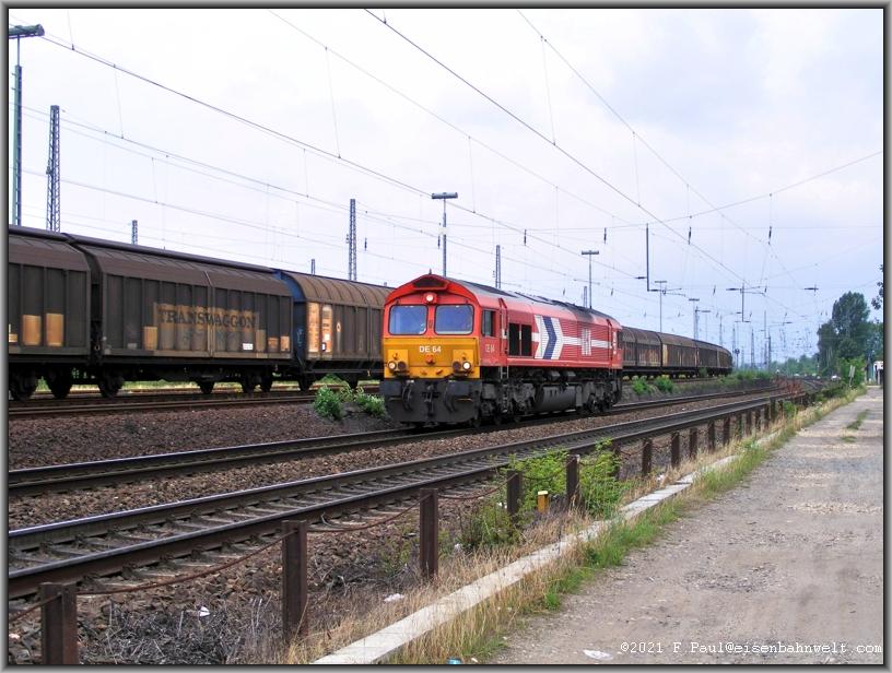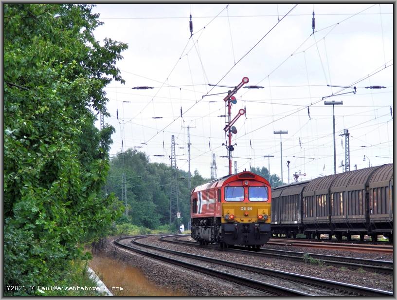 Kaum ist der ICE verschwunden, naht auch schon mit tiefem Brummen in langsamer Fahrt HGK-DE 64, eine Class-66-Lok als Tfzf 92210 von Gelsenkirchen nach Köln-Eifeltor.