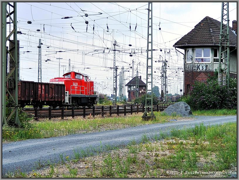 den Bahnhof. Ich verlasse meinen Fotopunkt und laufe weiter in Richtung des aus der Ferne schon sichtbaren Stellwerks "Ksf" an der Südausfahrt von Köln-Kalk Nord. Ein großer Parkplatz