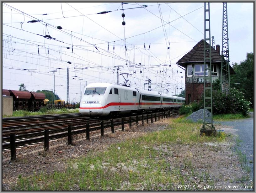 Kaum bin ich eingetroffen, schlängelt sich auch schon Tk 402 042 als ICE 944 auf der Fahrt zum Flughafen am Stellwerk vorbei.