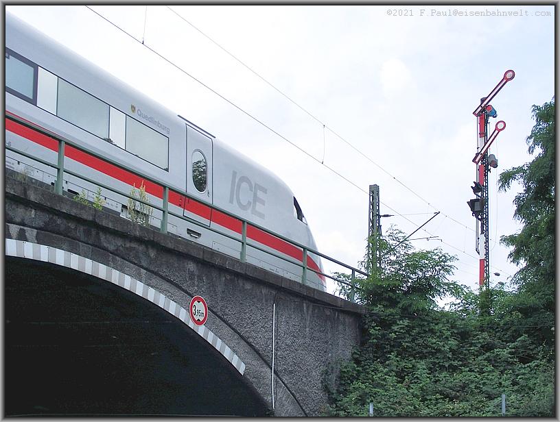 Nun aber los, in Richtung Gremberg. Die Straße schlängelt sich unter der Brücke durch, als 402/802 042 als ICE 941 vom Flughafen zurückkehrt. Hp 2 für den ICE