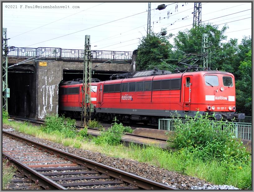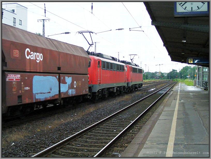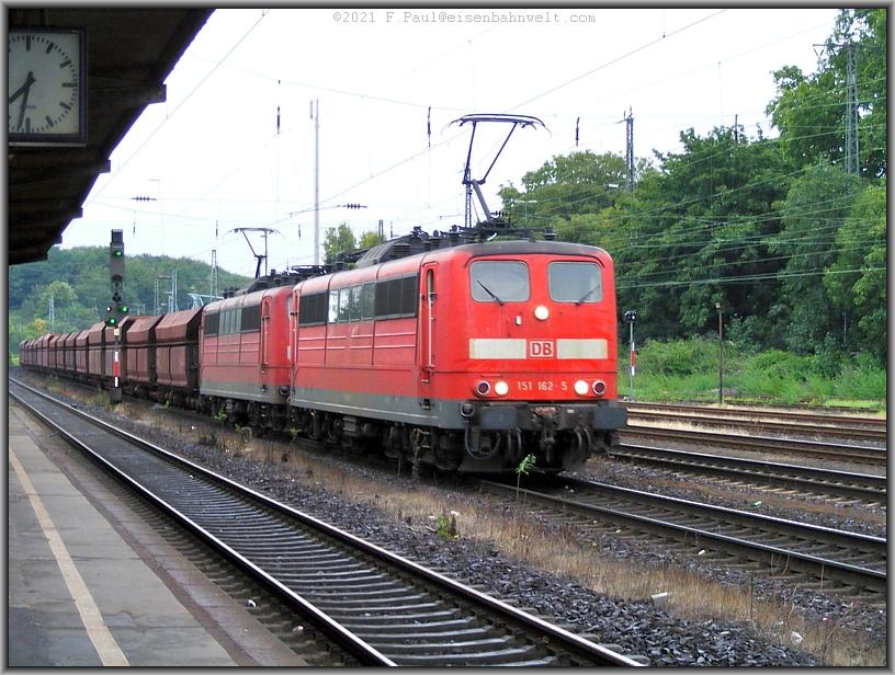 Und auf dem Gütergleis nähert sich ein Schwerlastzug: 151 162 und 151 112 befördern den Erzzug CHL 48711 von Rotterdam zur Dillinger Hütte. Die Grenzlast dieser mehrmals täglich verkehrenden