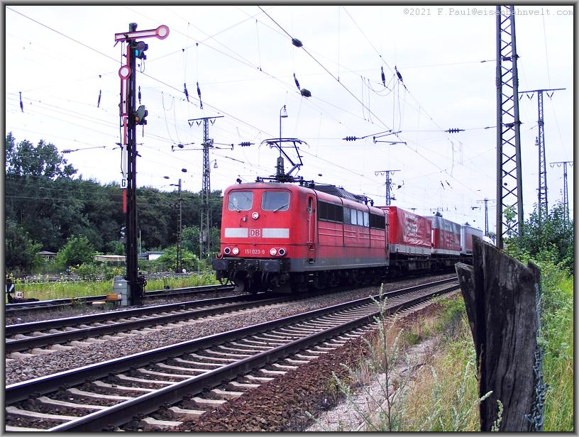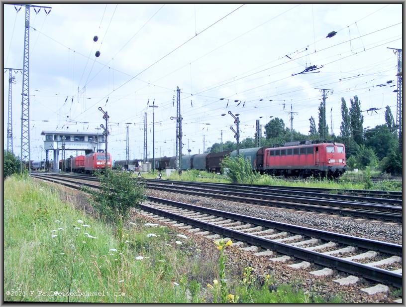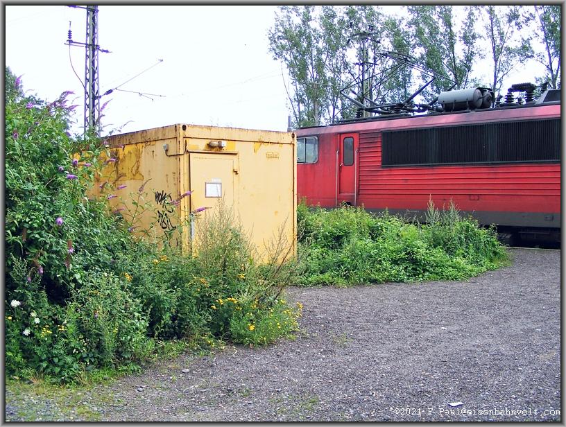 ergreifen die Pflanzen Besitz vom Bahndamm.... 152 110 passiert in der Gegenrichtung mit CS 60253 (Ziltendorf-Ehrang) die Stelle, in dieser Richtung hat der Lokführer allerdings schon