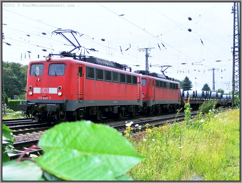 Fasziniert verfolge ich das Geschehen! Mit ihrem schweren CHL 61613 für das Blechverarbeitungswerk Rasselstein in Neuwied rumpeln 140 846 sowie 140 873 durch den Bahnhof,