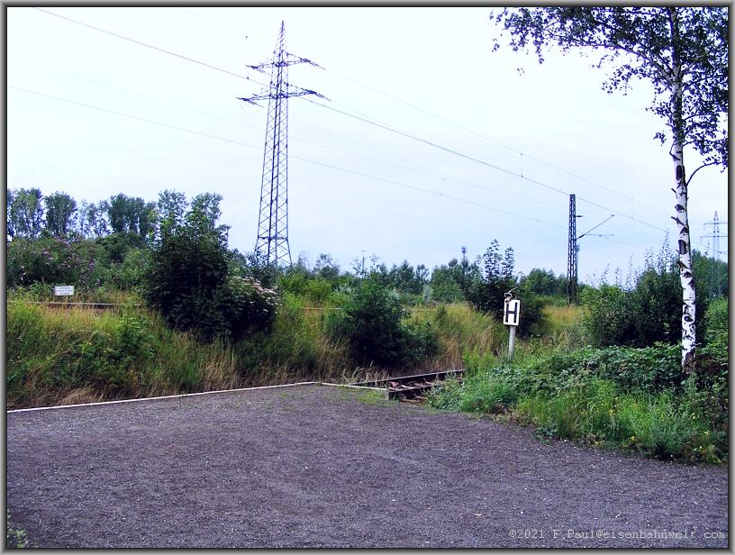 in Höhe des Formvorsignals von "Km". Die Strecke verläuft hier auf einem zugewachsenen Damm. |