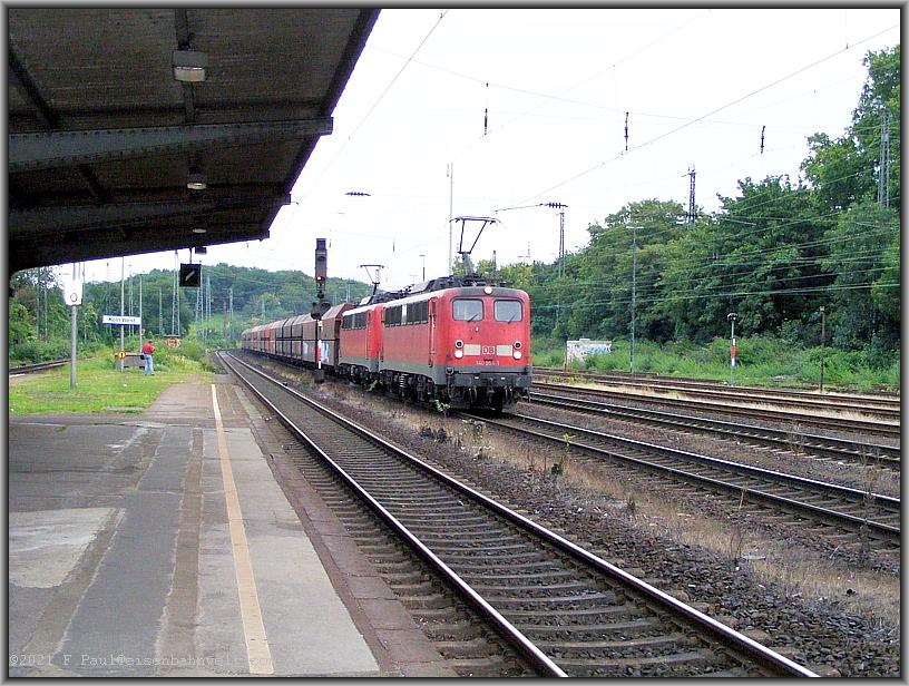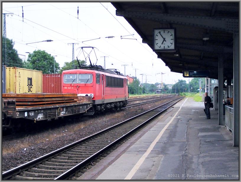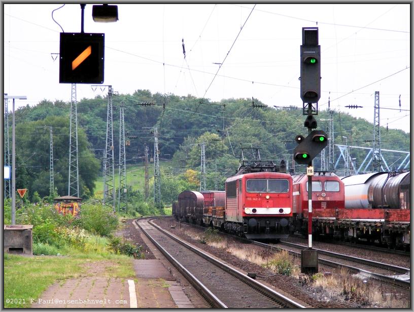 reichlichen Betrieb. 155 142 hat am Einfahrsignal gehalten und rumpelt nun mit mäßiger Geschwindigkeit mit FE 44517 aus Antwerpen nach Gremberg durch den Bahnhof, derweil der Regen