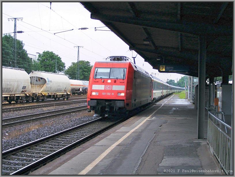 leise schnurrt 101 132 mit EC 6 (Chur-Hamburg) durch den Bahnhof. Dieser EC ist der letzte der verbliebenen EC-Langläufe mit Schweizer Wagen... |