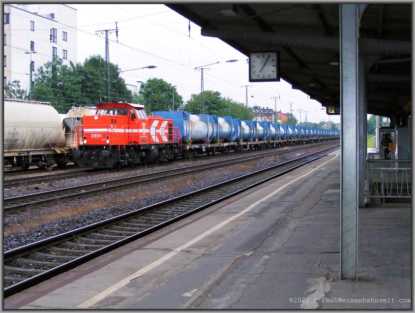 zur Verbrennungsanlage in Köln-Niehl. Die MaK-Lok DE 81 zieht heute die Spezialgüterwagen als DGS 59706 durch Köln West. In der Gegenrichtung rollt 110 245 auf der Suche nach Aufgaben