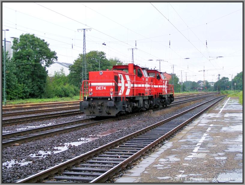 Kurz daruf brummen die HGK-Loks DE 75 und DE 74 als Tfzf 57929 aus Köln-Bickendorf in Richtung Heimatbahnhof Brühl-Vochem durch Köln West. Und aus der Gegenrichtung