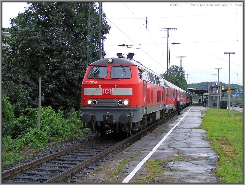Am Bahnsteig hält inzwischen 218 216 mit RE 12089 nach Gerolstein. Der Steuerwagen ist schadhaft und der Zug verspätet, eilig erteilt der Zugbegleiter das Abfahrtsignal.