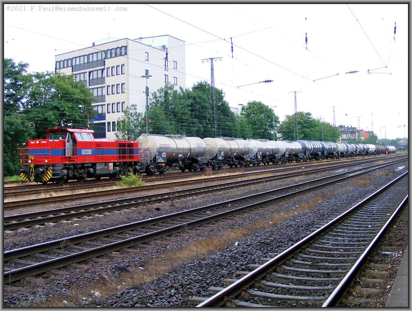 nähert sich ein weiterer Wettbewerber: Die Werkbahn des Bayerwerkes Leverkusen firmiert unter dem Namen "Chemion", die MaK-Lok Nr 6 rollt mit DGS 59917 aus Köln-Kalk Nord in das