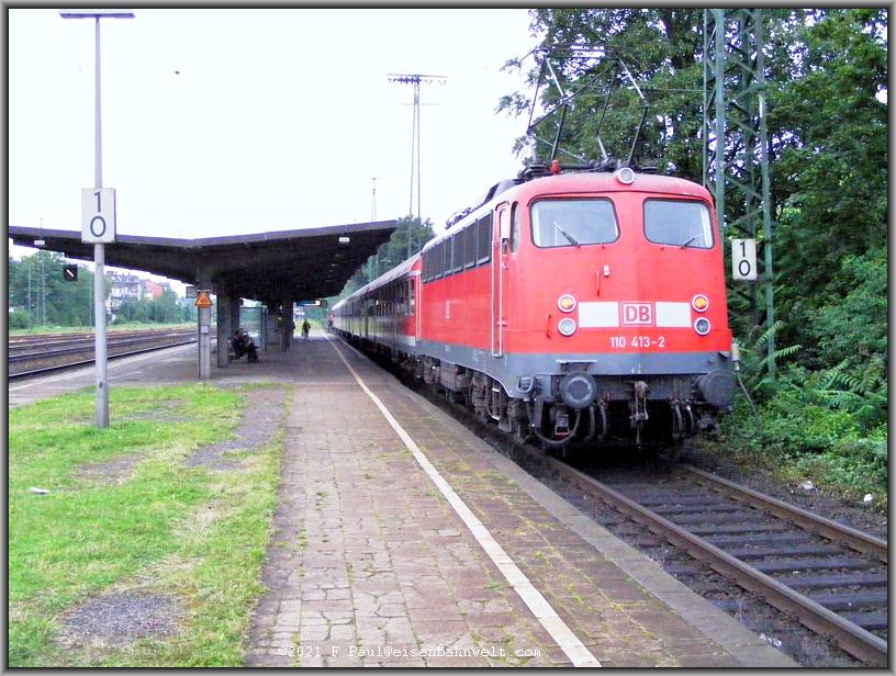 Auf Gleis 1 fährt derweil RB 11229 ein, 110 413 schiebt den Zug der Linie 48 nach Bonn-Mehlem. Der Endpunkt dieser Linie ist der Deutschen Kleinstaaterei geschuldet: