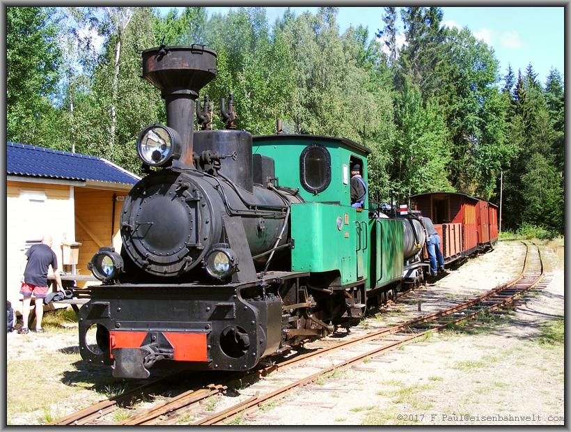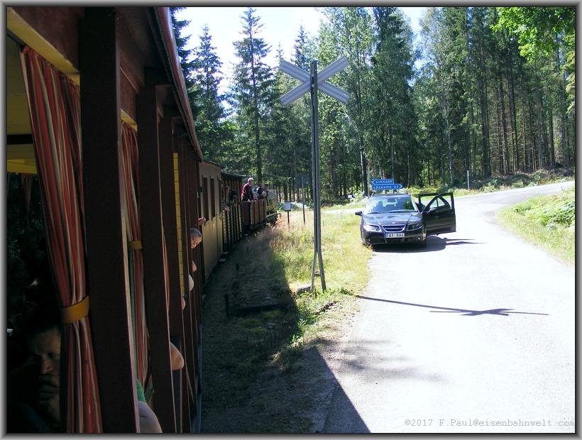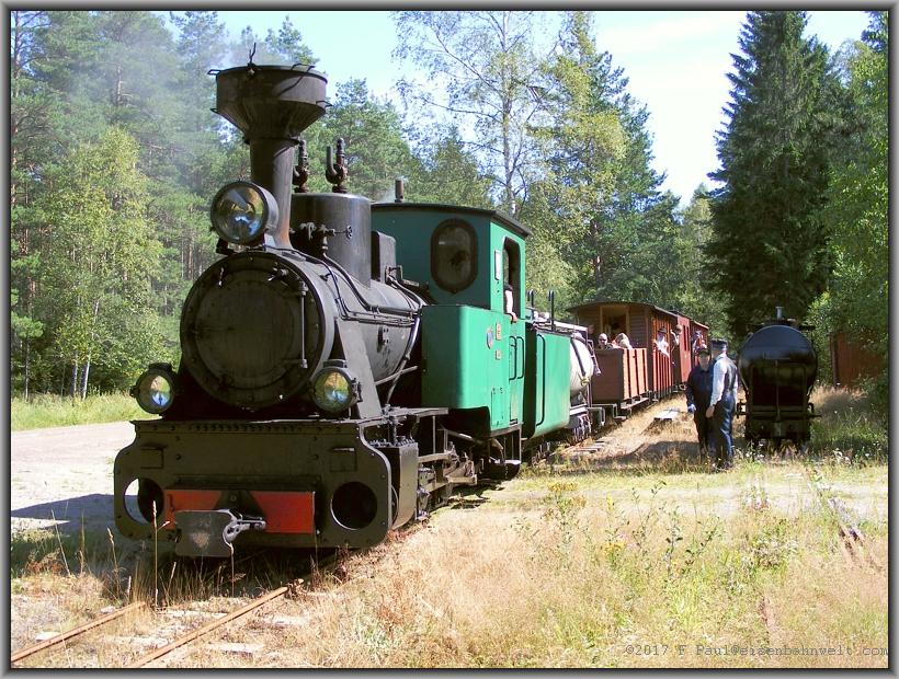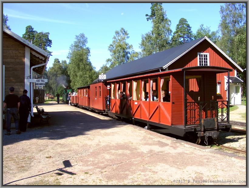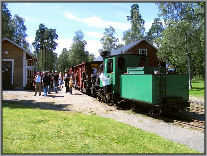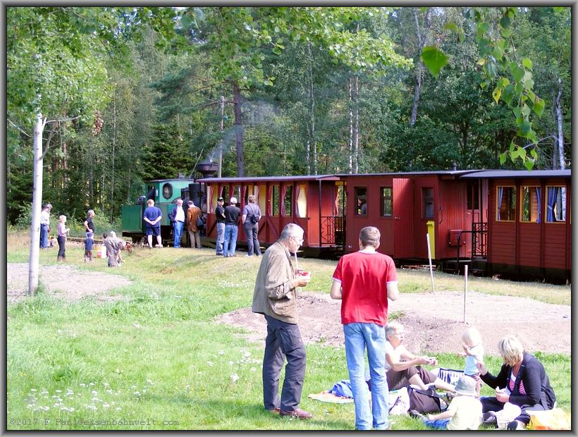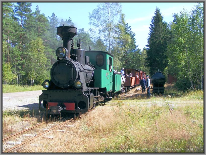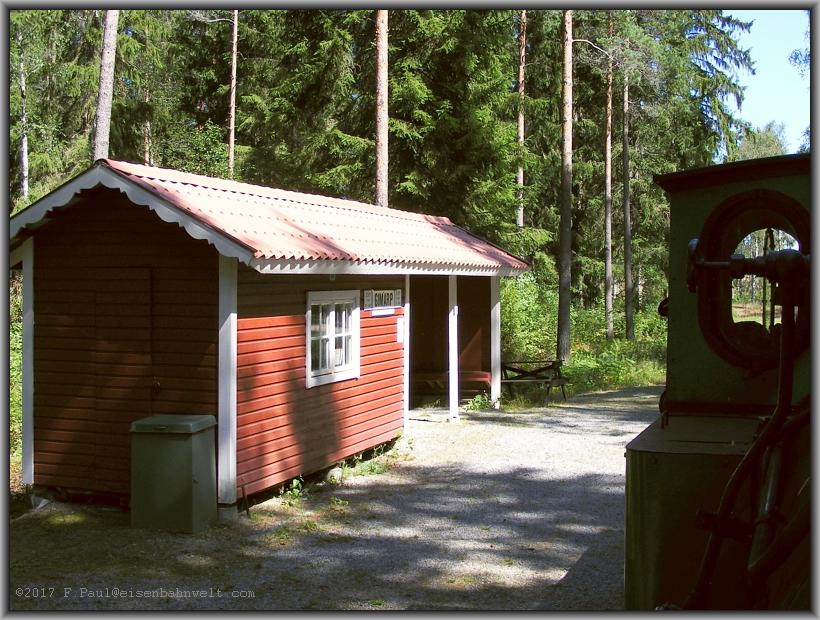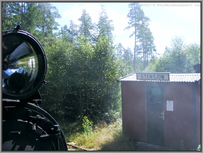 nur bis zu diesem Ort. Nach kurzem Aufenthalt geht die Fahrt weiter nach der mitten im Wald gelegenen Station Stensjön. Auf dem Ausweichgleis steht ein alter