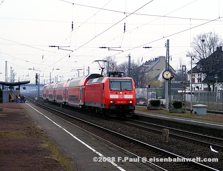 erwartet uns. Links hält kurz 146 003 mit dem "Rhein-Haardt-Express" RE 10210 nach Mönchengladbach, rechts erreicht 643 005 als RB 20115 aus