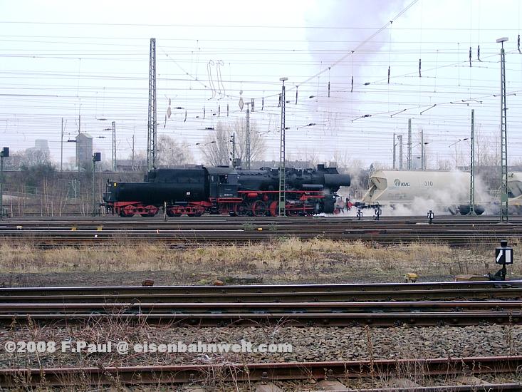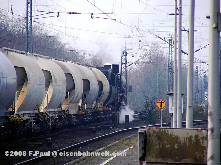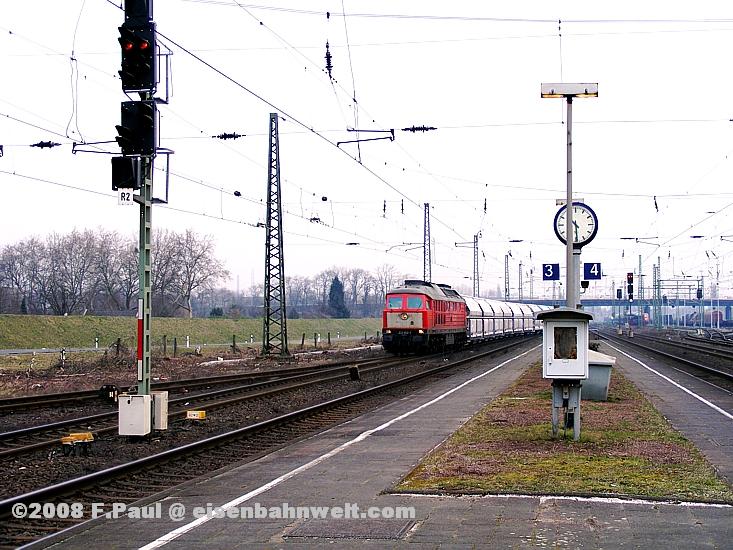 durch den Bahnhof. Der Ganzzug besteht aus Spezialwagen für den Kalktransport zum dortigen Braunkohle-Kraftwerk. Dieser Stoff wird zur dort zur Rauchgasentschwefelung benötigt,