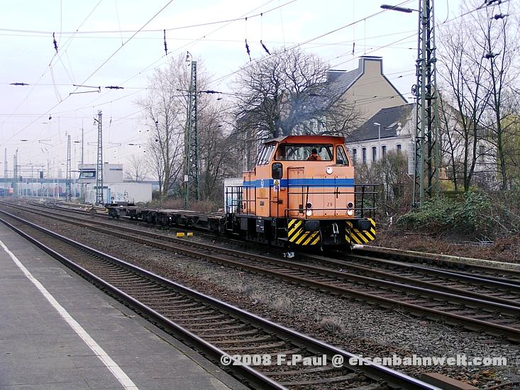 Und auf dem Ausziehgleis des Rheinhausener Güterbahnhofs rangiert Lok Nr.29 der Duisburger Hafenbahn mit einigen leeren Flachwagen. |