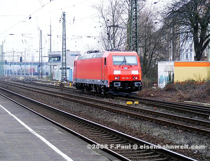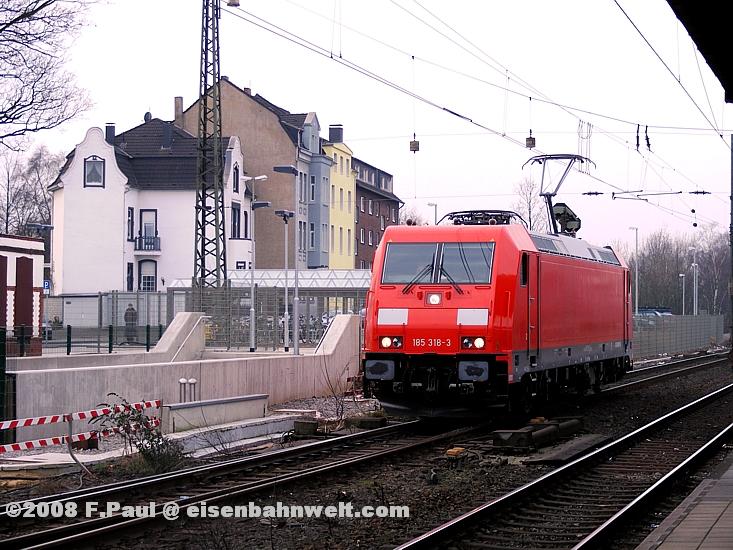 Auch 185 318 ist in Rheinhausen mit FZ 54166 von Oberhausen-Osterfeld eingetroffen und rangiert jetzt über das Ausziehgleis zum