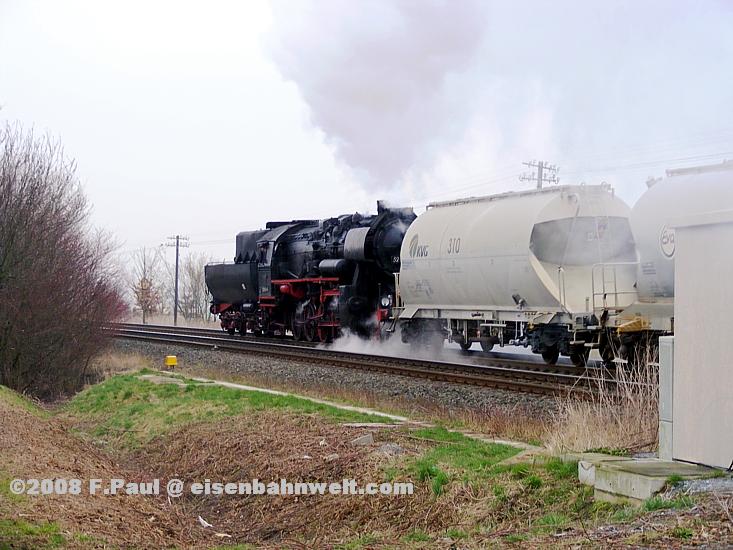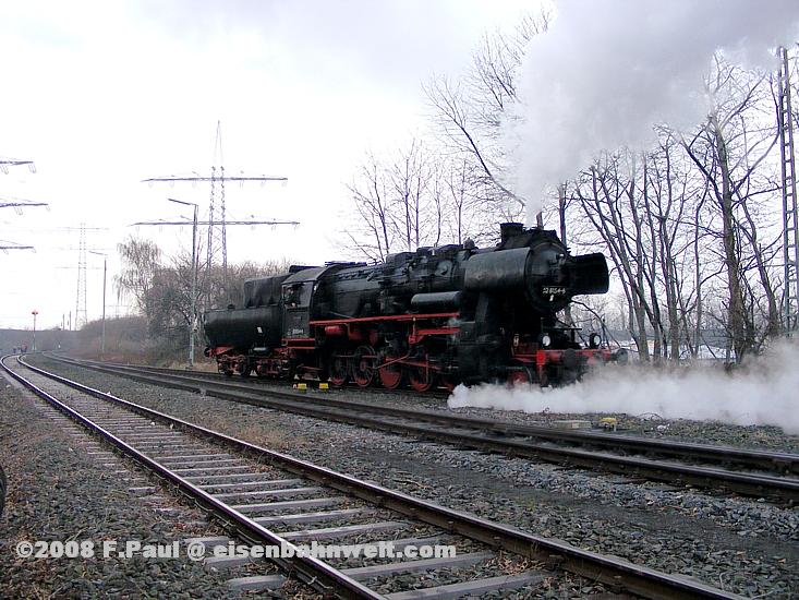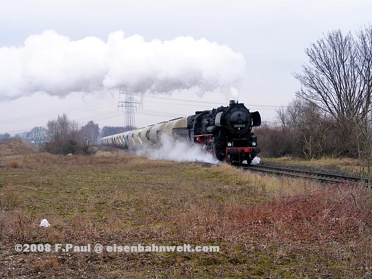 Langsamfahrstelle (20 km/h) und bergauf muß auch noch einmal ordentlich Dampf gemacht werden! Dumpf hallen die Abdampfschläge in den wolkenverhangenen Himmel! |