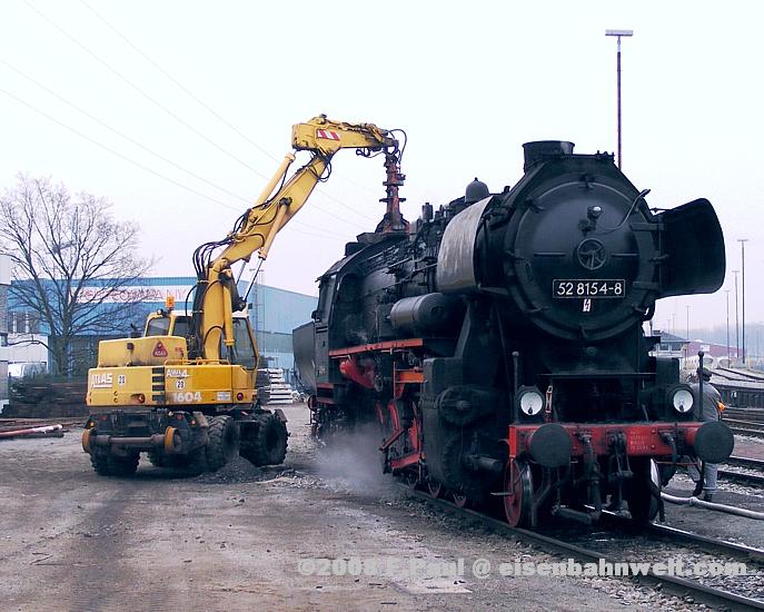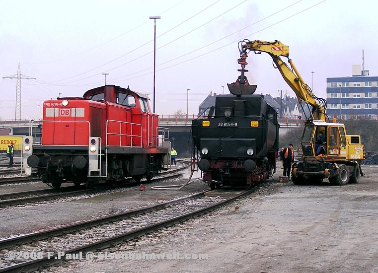 Behandlungsanlagen für Dampfloks sind natürlich auch in Neuss-Hessentor nicht mehr vorhanden. Das Wassernehmen erfolgt aus diesem Grund mittels Schlauch vom Hydranten, Kohle bringt ein Bagger.