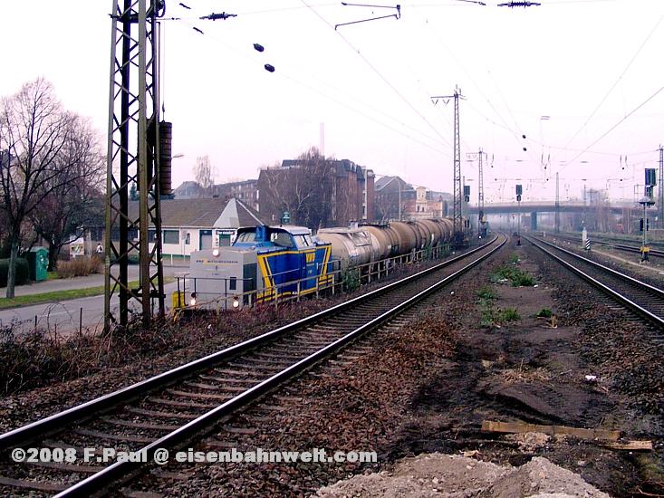 Durch das Straßengewirr von Neus geht es zum dortigen Güterbahnhof, gerade rechtzeitig, um noch einen Blick auf die in Richtung Hessentor ausfahrende Lok zu erhaschen. Neuss-Hessentor