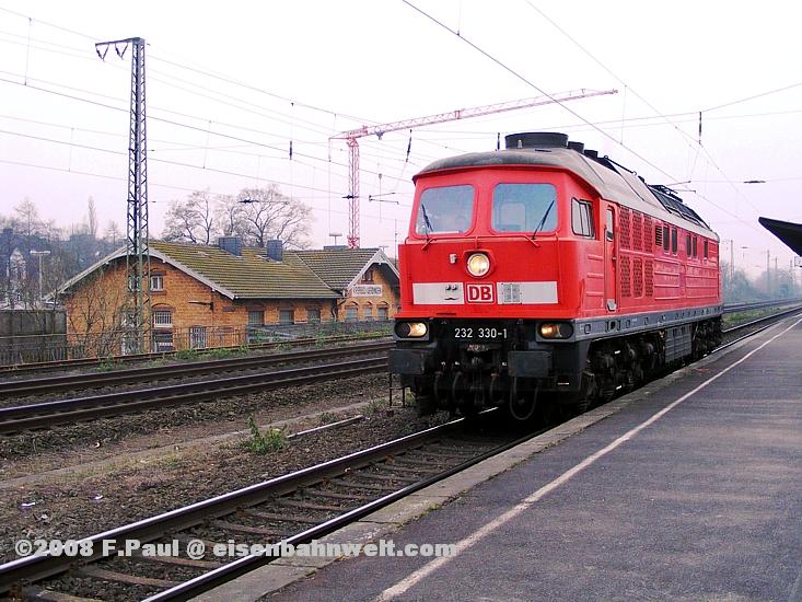 Während des Rangierens erhält die frisch lackierte 232 330 auf Arbeitssuche keine Einfahrt in den Bahnhof und rollt langsam auf das "Hp 1" zeigende Signal zu, im Hintergrund der Baukran für den neuen Bahnsteigtunnel.