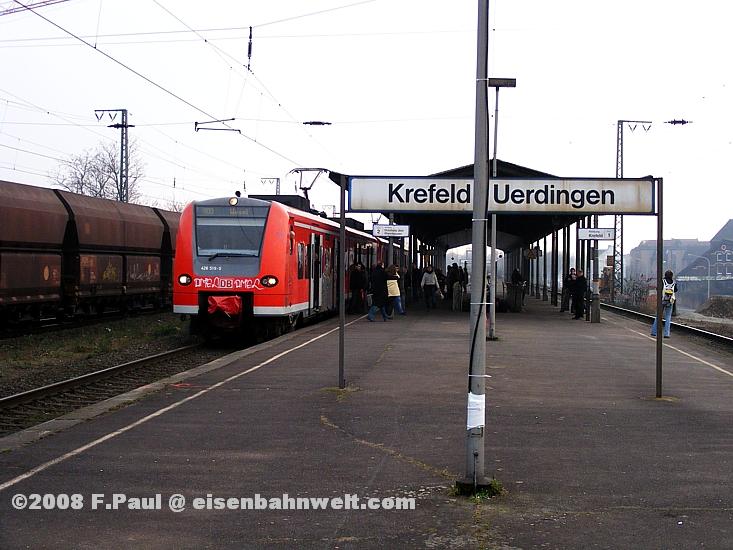 "Rhein-Haardt-Expreß" trifft "Rhein-Niers-Bahn": 146 006 erreicht Krefeld-Uerdingen mit RE 10222 (Münster-Mönchengladbach), ein Doppel-Tz der BR 425 (526/576 am Schluß) verläßt den Hp als RB 11070 (Aachen-Duisburg).