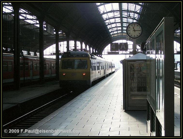 BR 614. Schnell den Bahnsteig 4 entlanggelaufen, da verläßt der Zug auch schon wieder die rostige Halle,