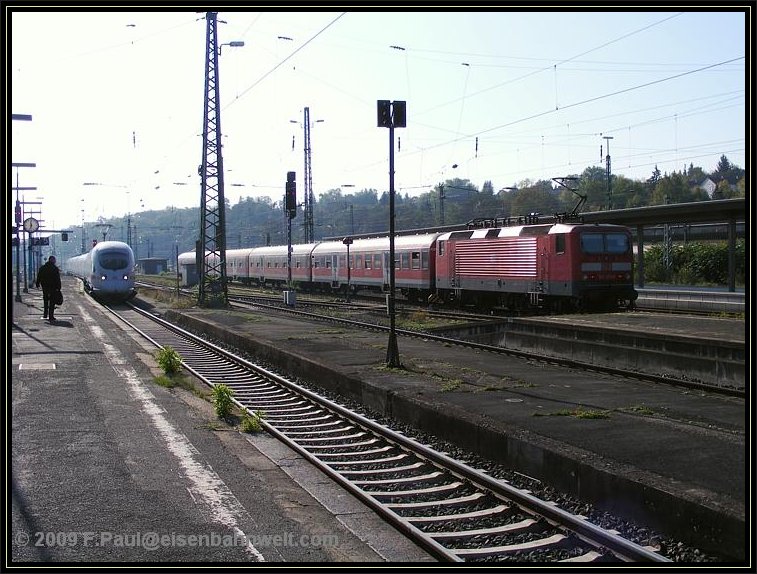 als ICE-T 1654 aus Dresden-Frankfurt(M) heran, gleichzeitig verläßt 143 971 ihn mit einem RE nach Frankfurt.