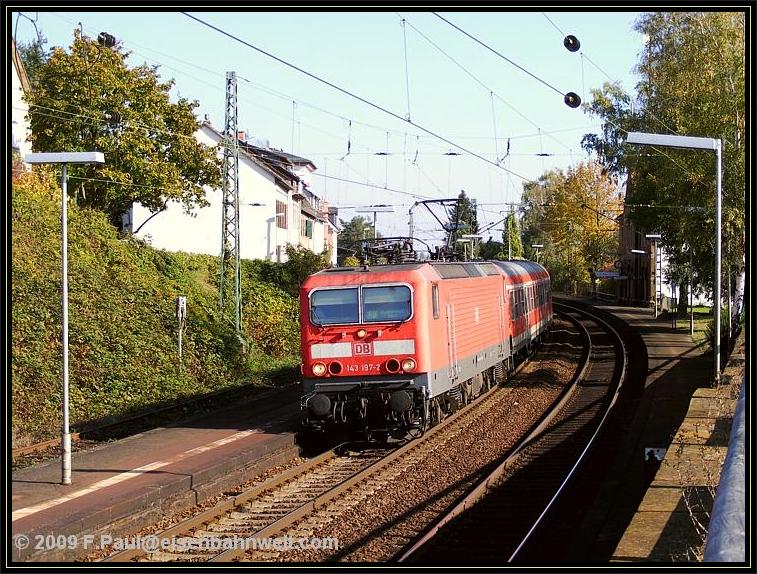 die aus Wiesbaden zurückkehrende 143 197 mit RB 15524 beim Halten in die Kurve. Und, siehe da, im Blockabstand folgt