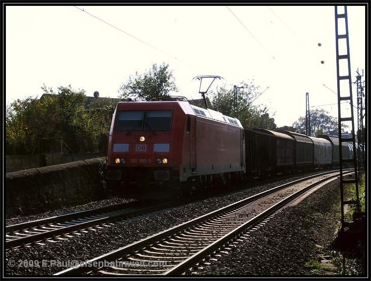 der Strecke, nehme bei der wohl dritten Schranke im Gegenlicht 185 380 mit dem Frachtenzug FIR 51341 von Gremberg nach Kornwestheim auf (rechts), bevor