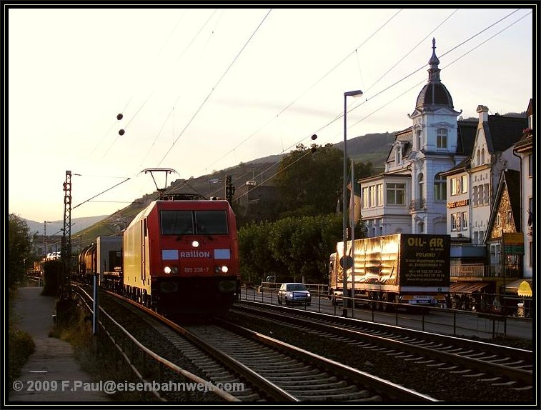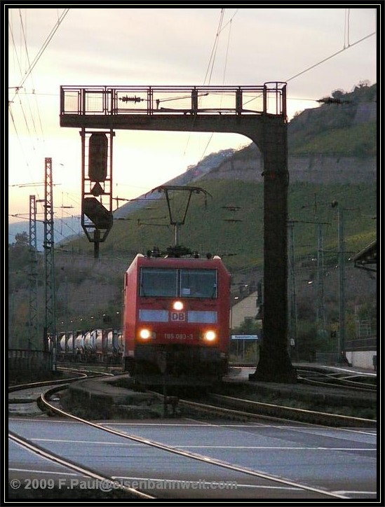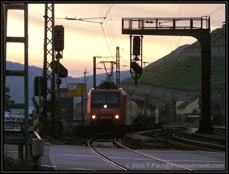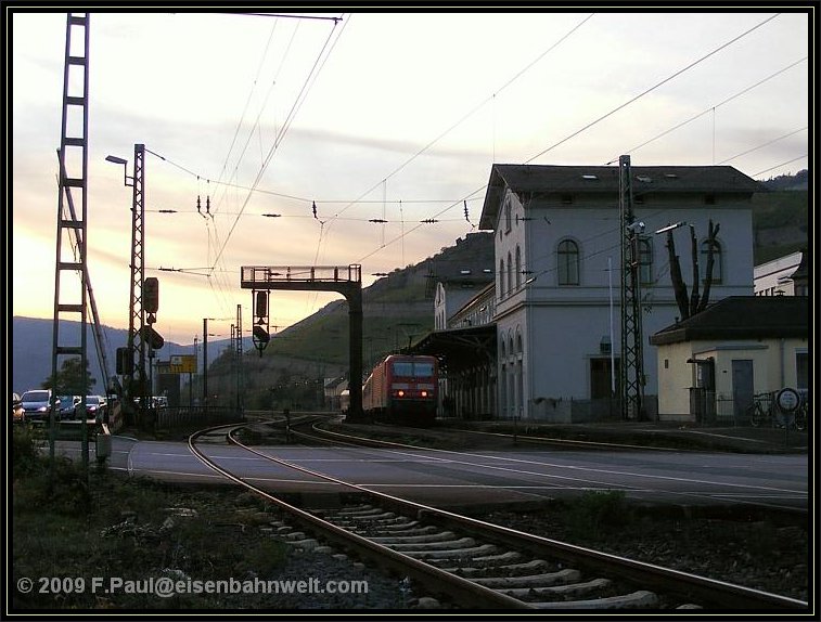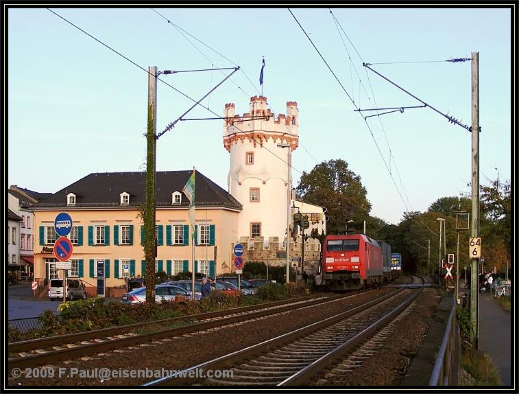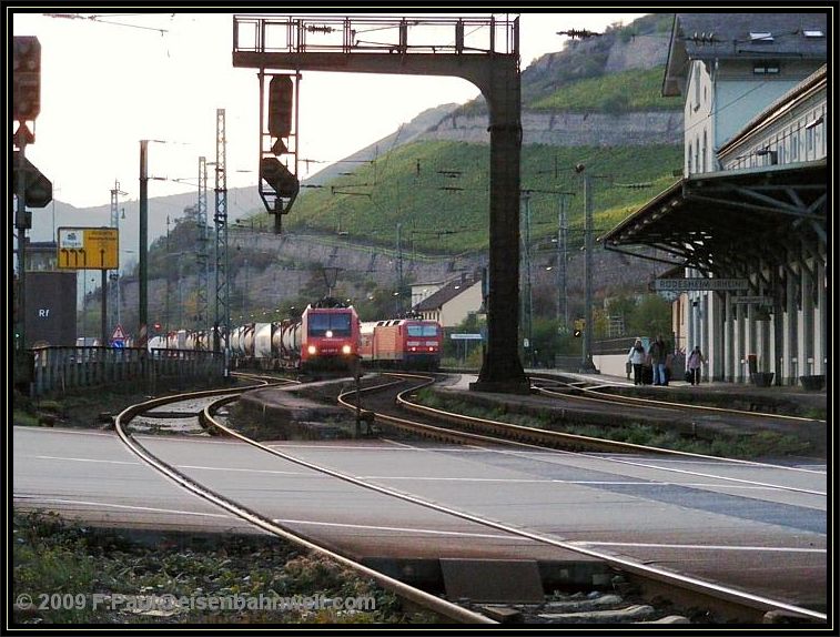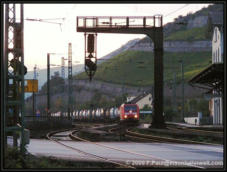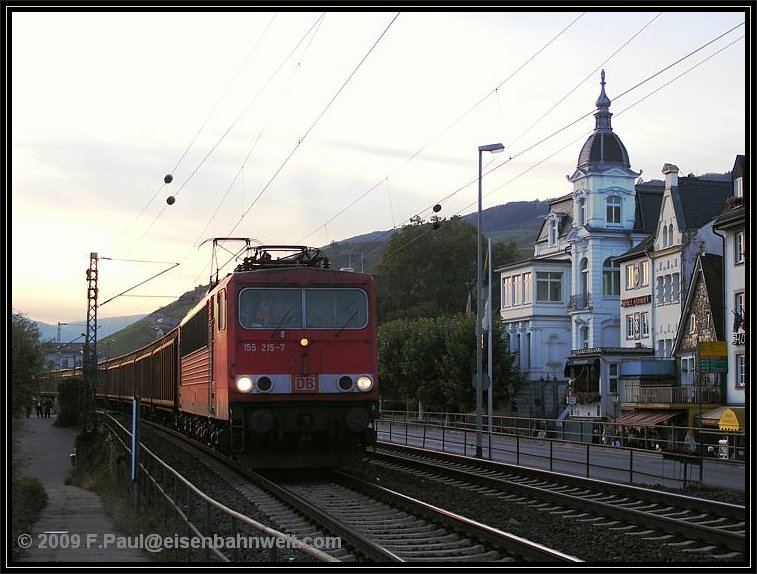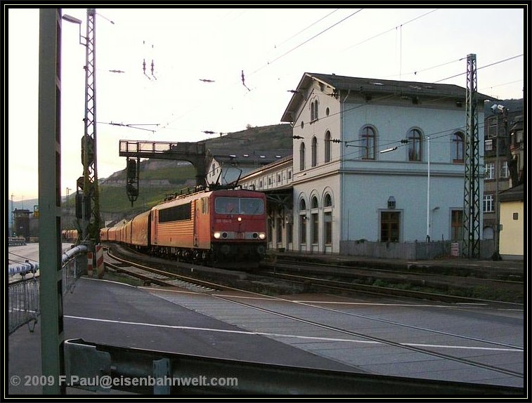Schließzeiten wird hier Rüdesheim zugestaut. Nun, jetzt am Abend hält sich das in Grenzen, eine weitere 155'er, 155 184 mit CFN 62434 nach Weimar, passiert ihn gerade mit