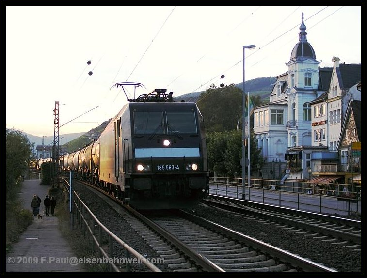 Güterzüge vorbeirumpeln: Den Anfang macht 185 236 mit FR 52325 von Koblenz-Lützel nach Mainz-Bischofsheim, gefolgt von Rail4Chem-185 563 mit DGS 49011 von Antwerpen nach Rotkreuz/Schweiz,
