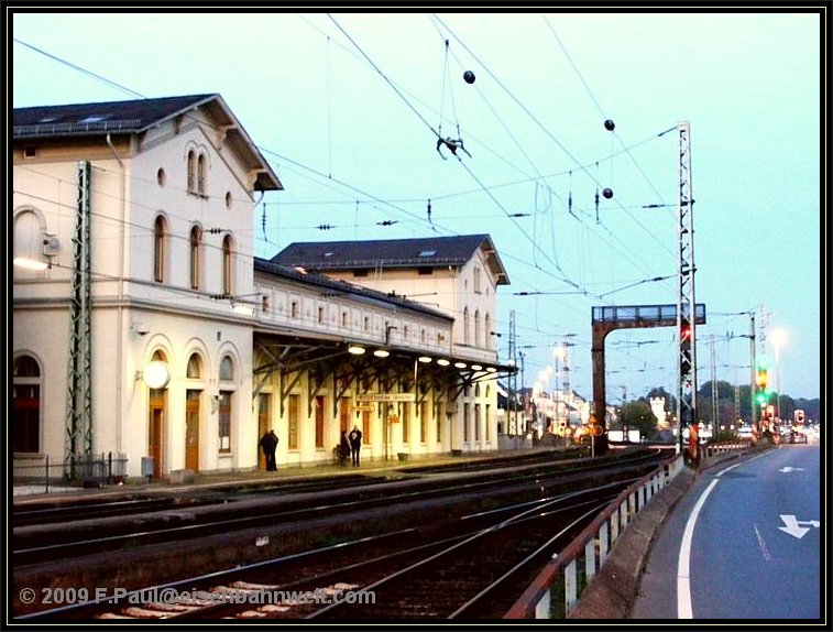 Der Bahnhof liegt in der Kurve, das Überholgleis ist, wie fast überall an der rechten Rheinstrecke, unbefahrbar.