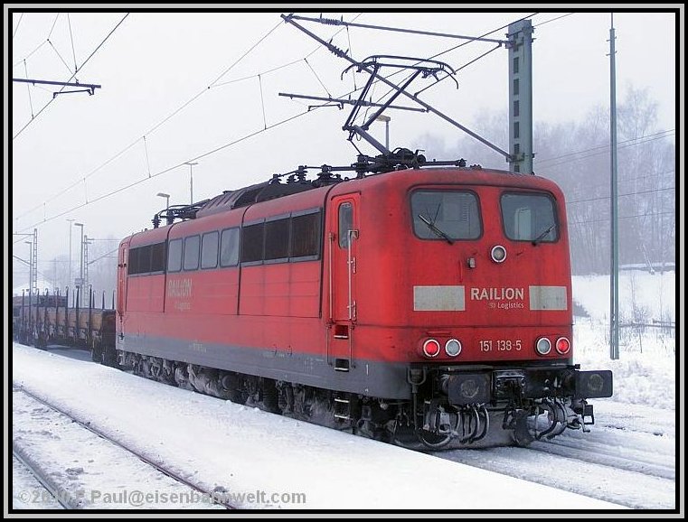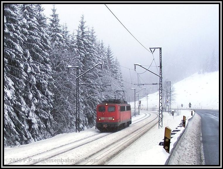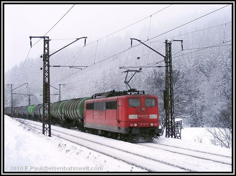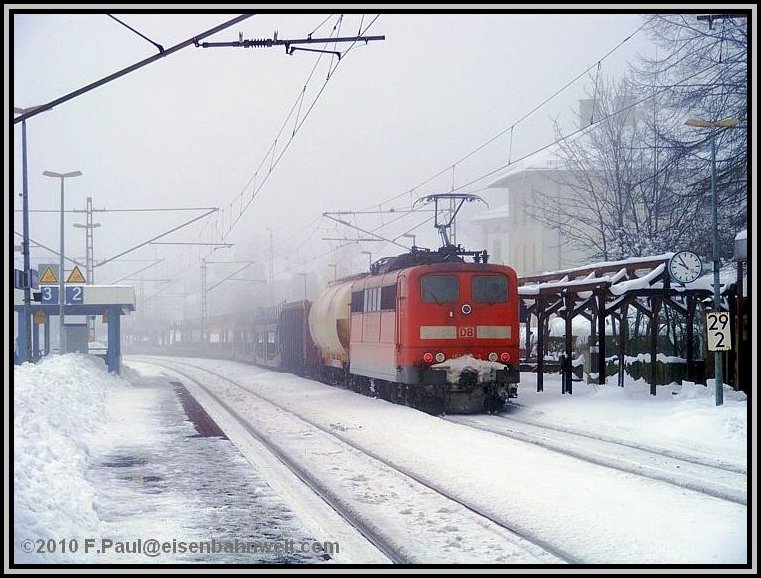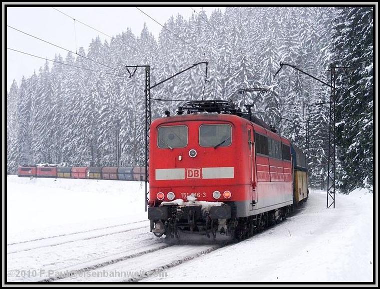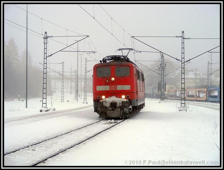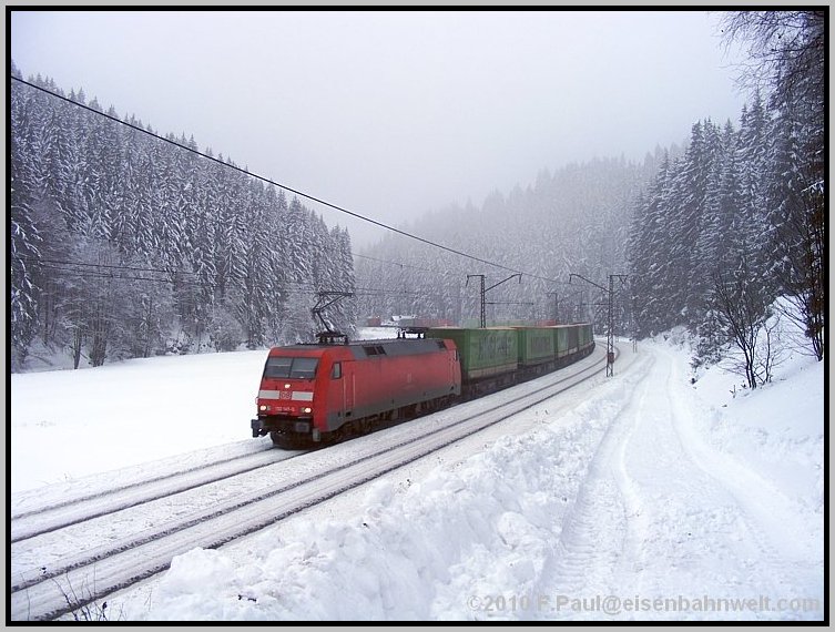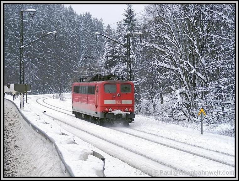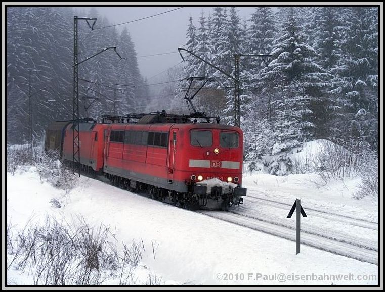 Während die RB schnell weiterfährt, mache ich mich auf den Weg ins Haßlachtal. Zuerst durch den Ort auf schmalen, durch den meterhohen Schnee gefrästen Gängen, später etwa einen Kilometer auf der vielbefahrenen B 85. Und hier kommen auch schon die ersten Züge vorbei: 140 569 rollt von ihrem Einsatz vor dem ICE 1607 zurück in Richtung Probstzella, und aus der anderen Richtung legt sich einmal wieder 151 016 als Vorspann bei 152 001 mit FIR 51713 in die Kurve. Dieser Zug hat immerhin 1592 Tonnen Wagenzuggewicht! |